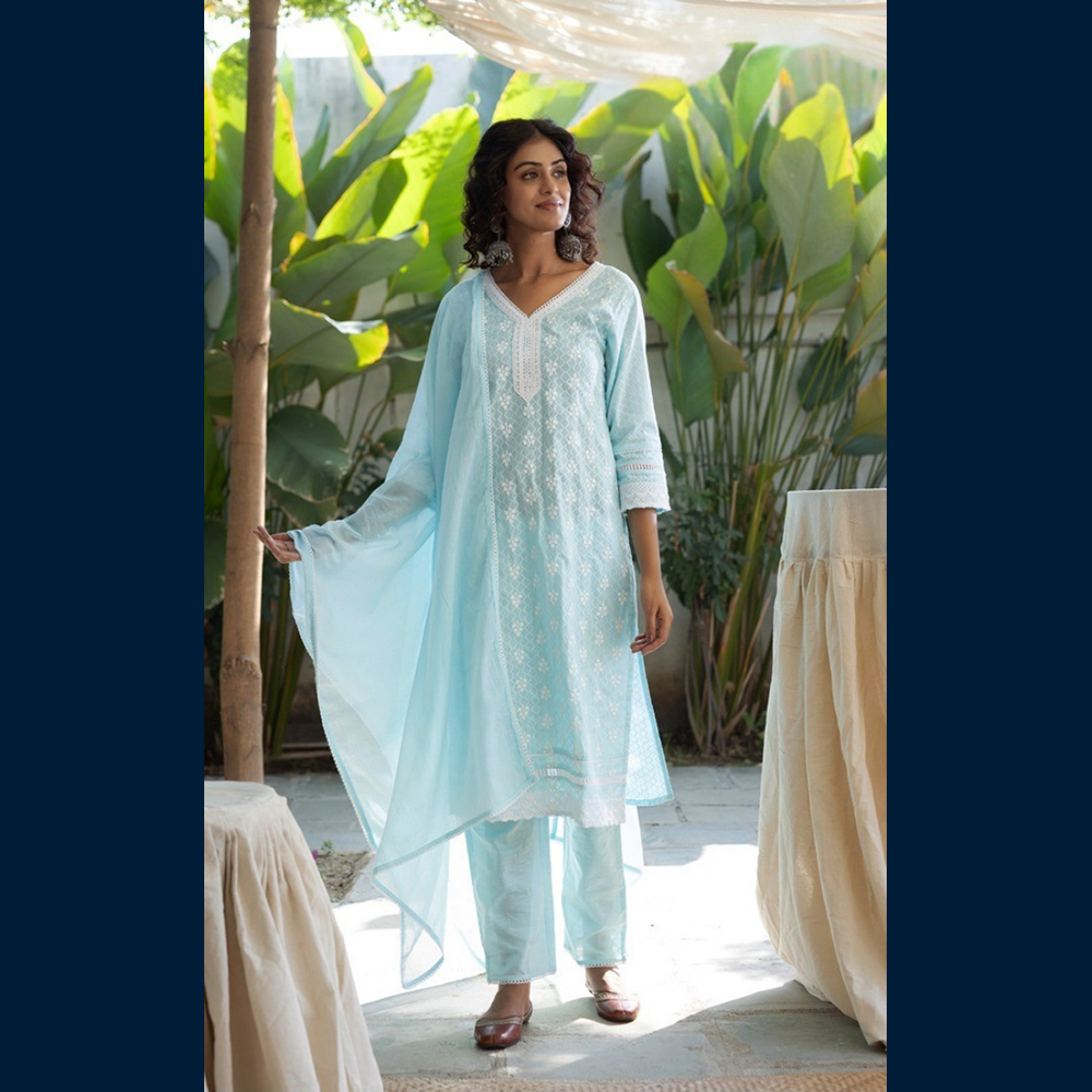 🌿 Soft pastel aqua kurta with delicate tonal thread embroidery