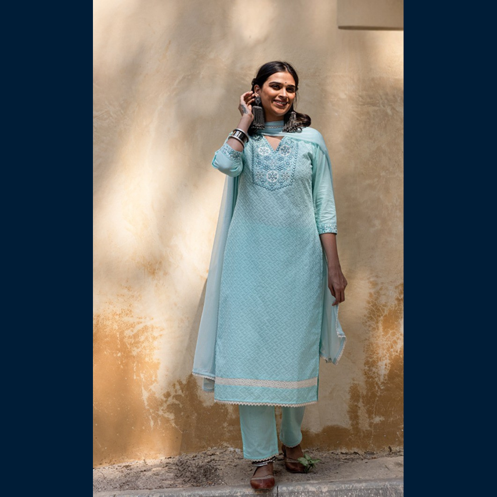Pastel aqua kurta with delicate embroidered yoke for a fresh, calming look 🌿✨