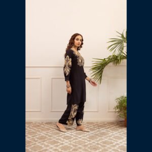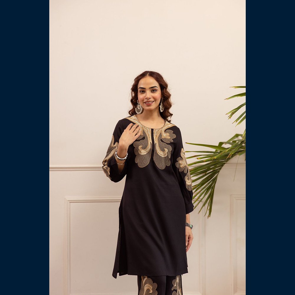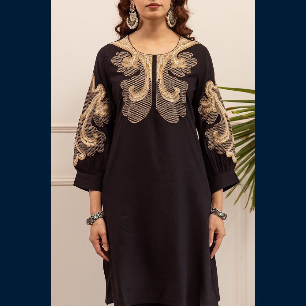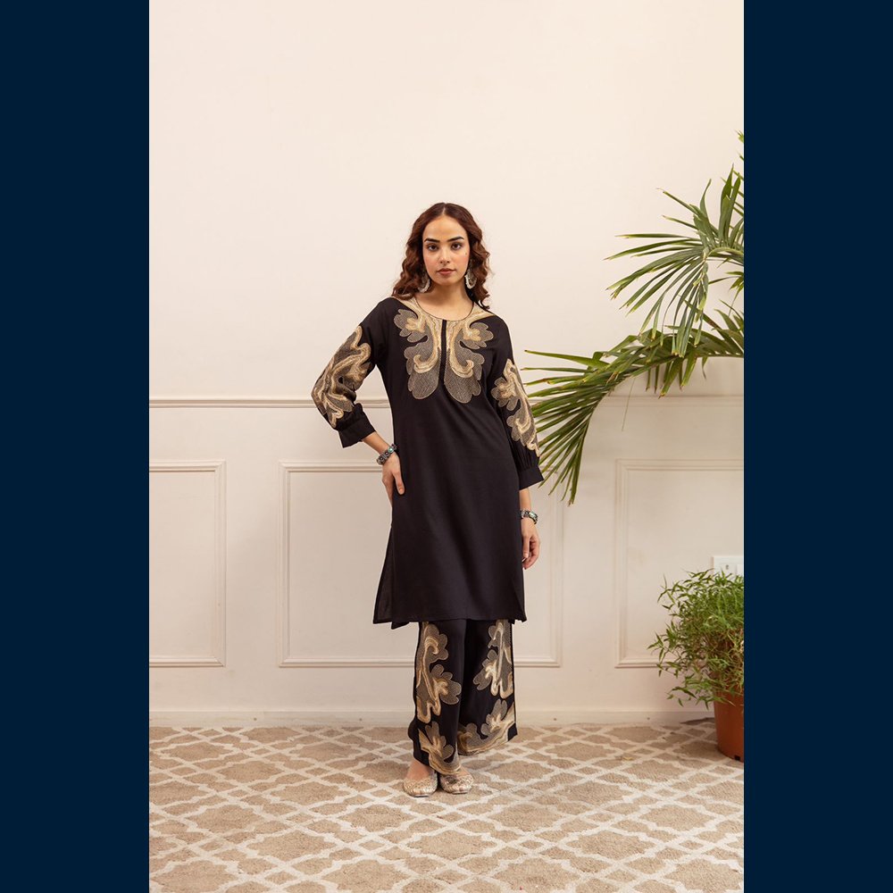 Black kurta featuring bold gold threadwork motifs for a luxe, regal vibe. ✨🌟