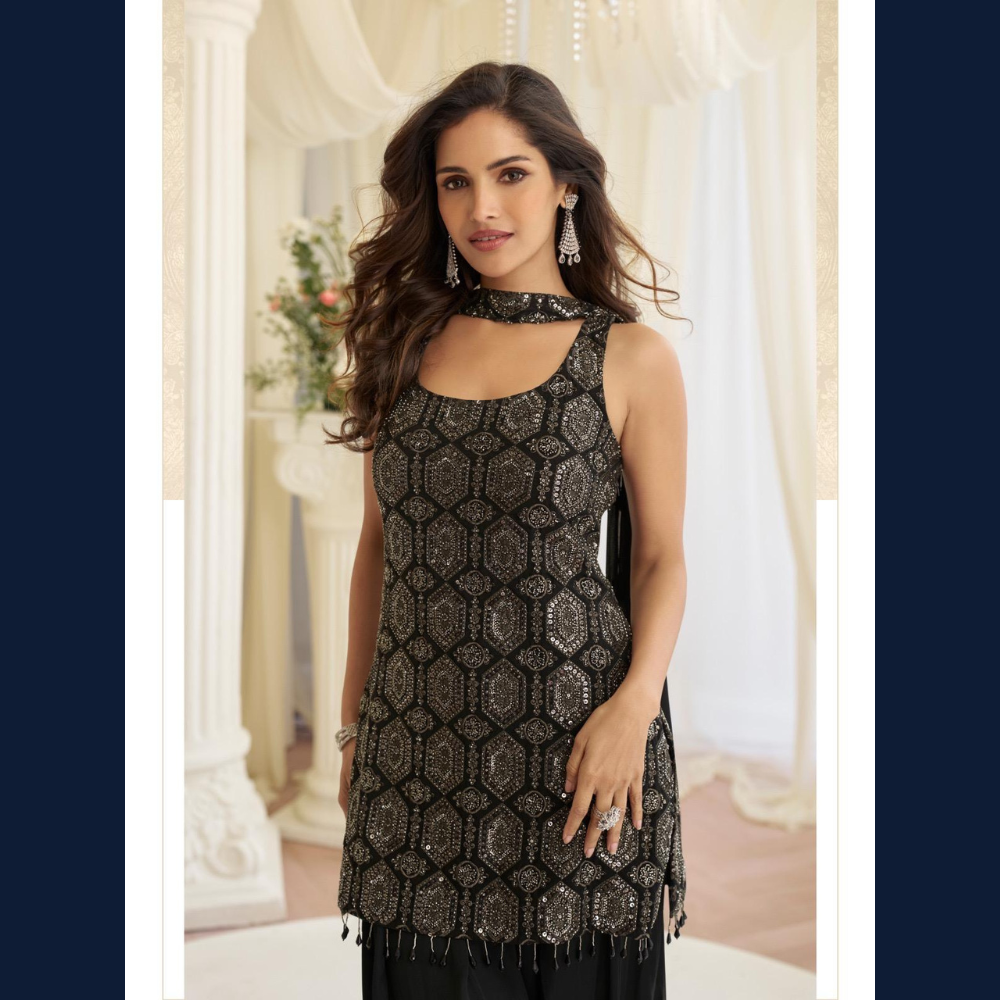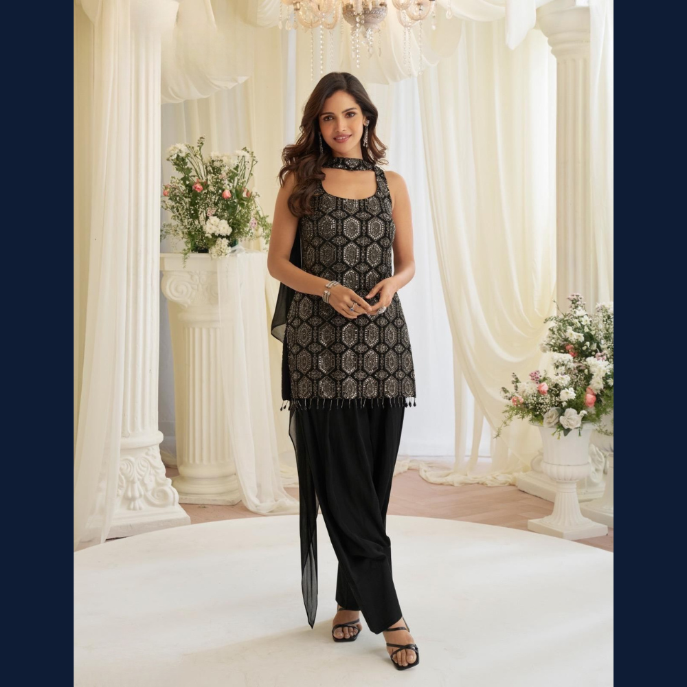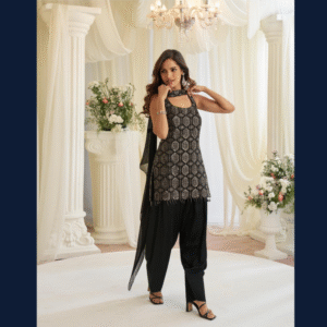 Pair with statement silver or diamond jewellery, strappy heels, and a sleek clutch. Keep hair softly waved and makeup bold with defined eyes for that timeless black elegance.