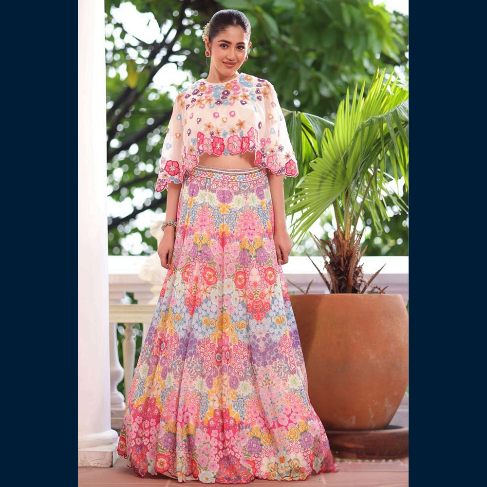 A dreamy pastel floral lehenga set bursting with candy-toned blooms — literally looks like spring decided to become an outfit 🌸💗