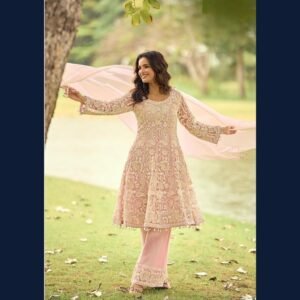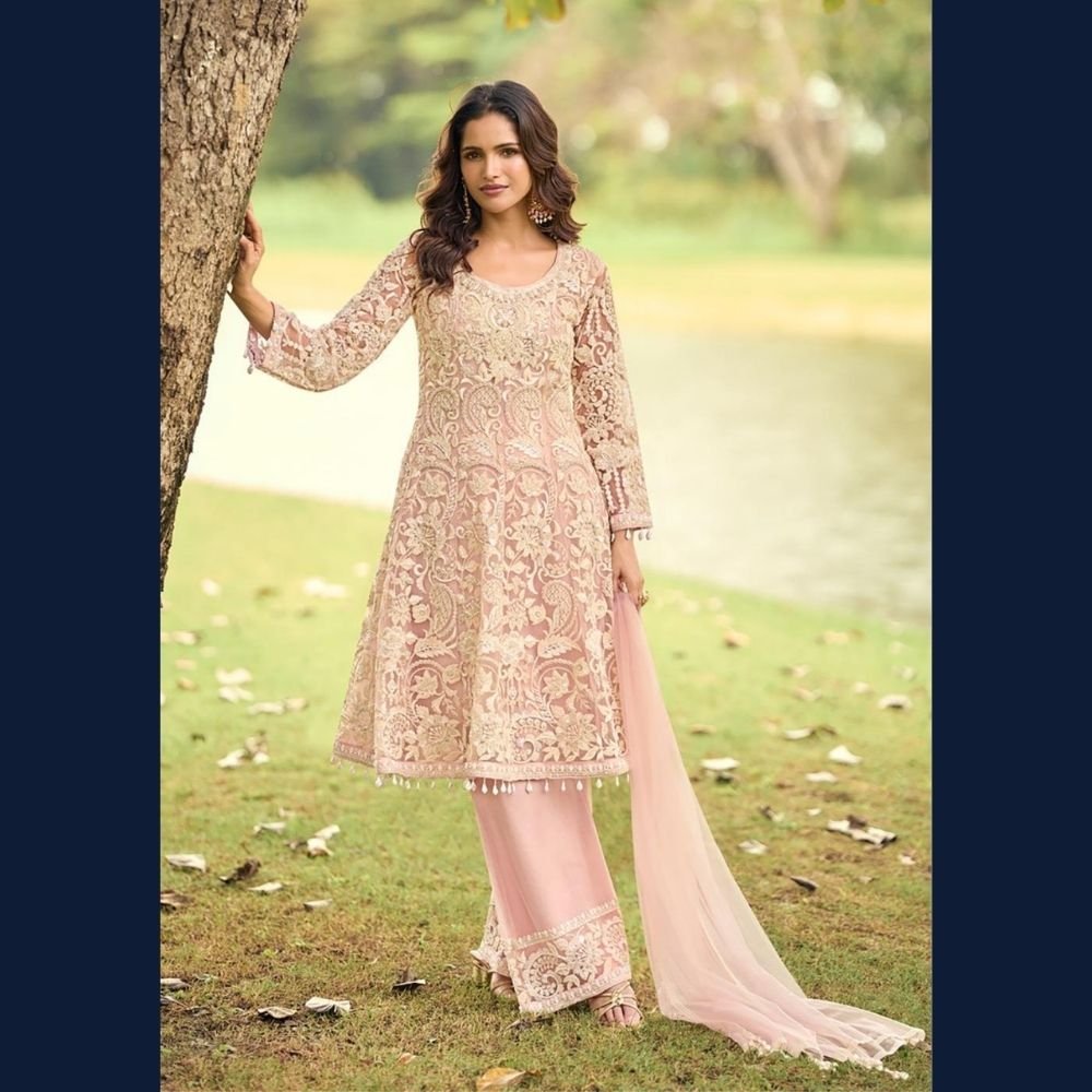 🌸 Elegant blush pink 3-piece ethnic suit set designed for a refined festive look
