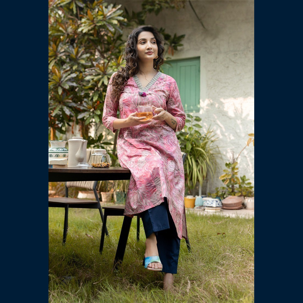 Soft coral-pink kurta with soothing leaf-print all over 🌿💗