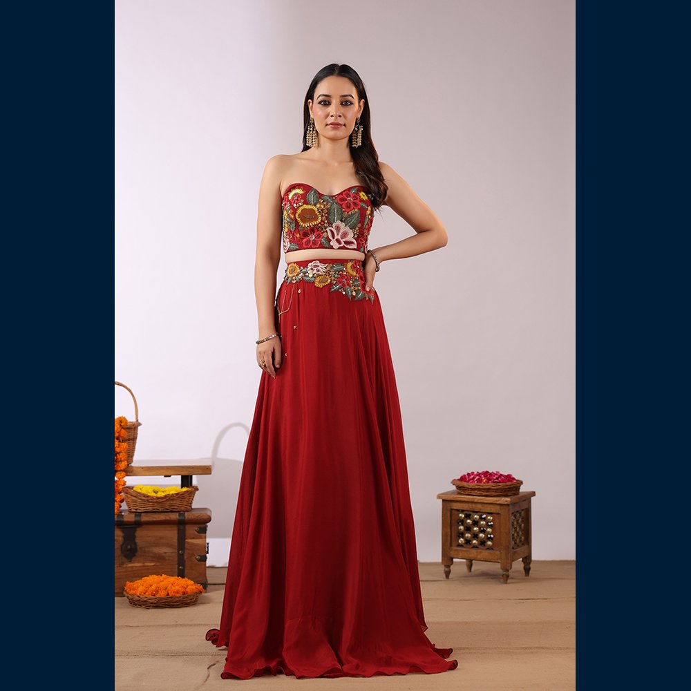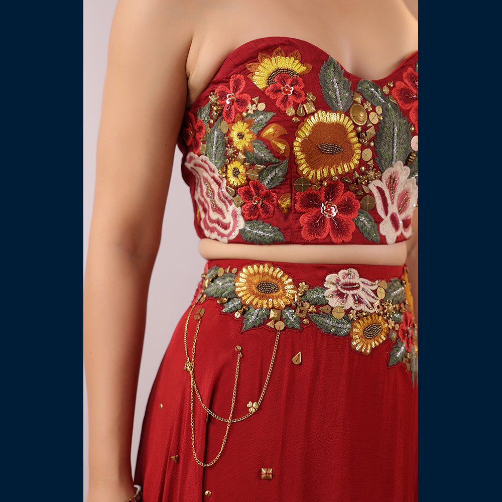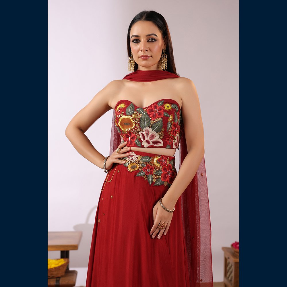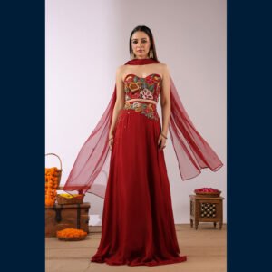 • 🌸 Vibrant floral embroidered bustier adding a modern–traditional charm.