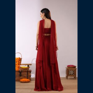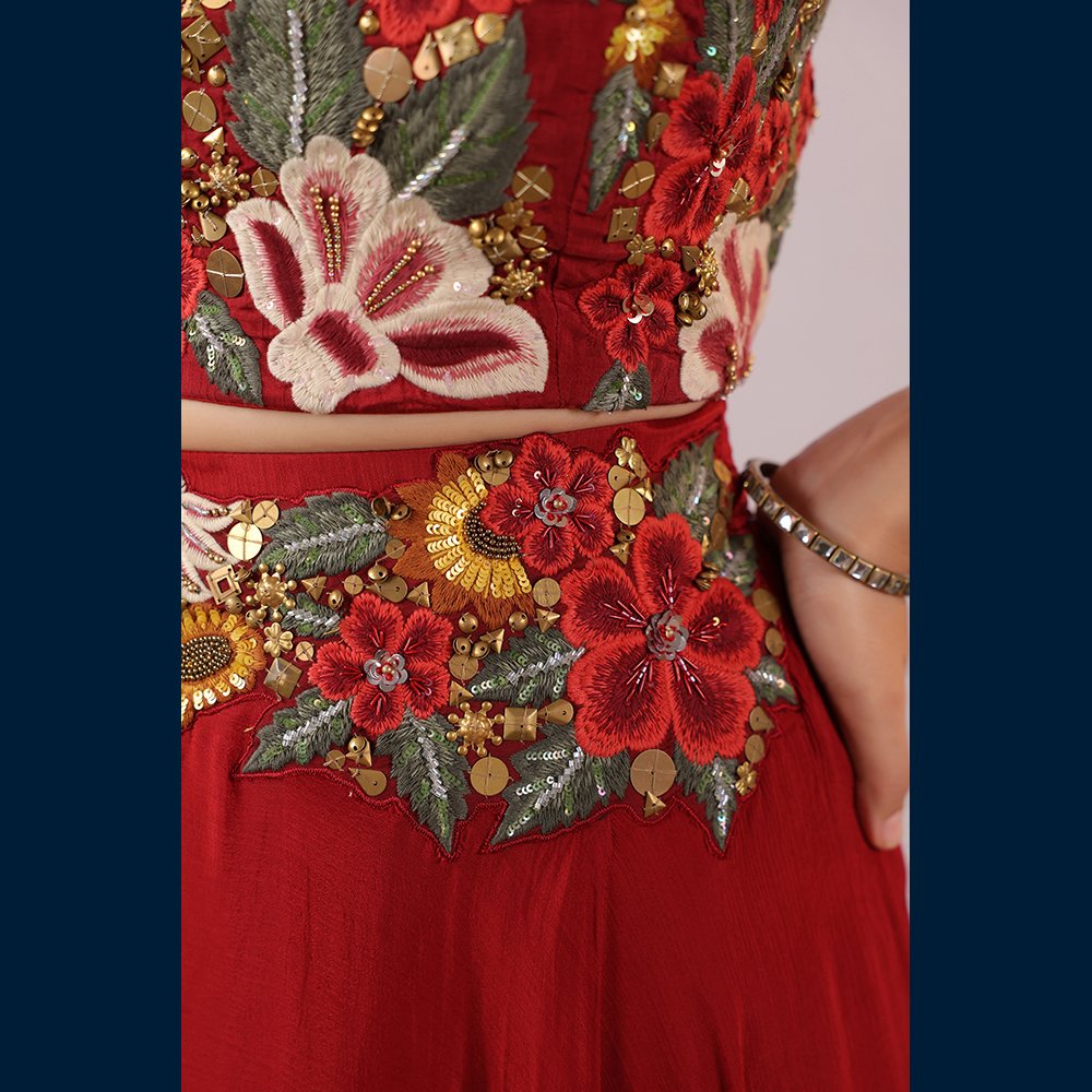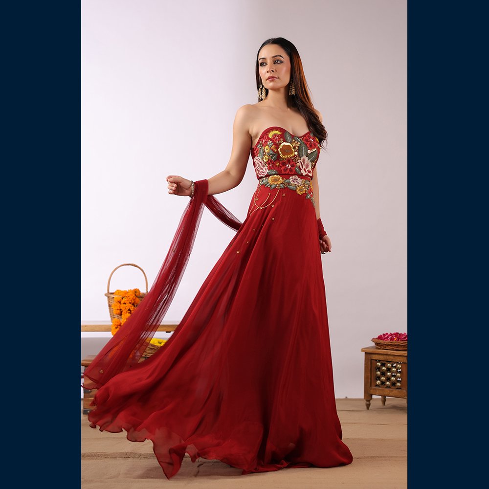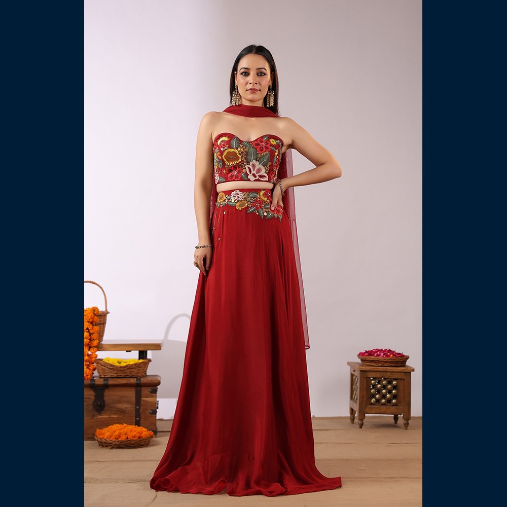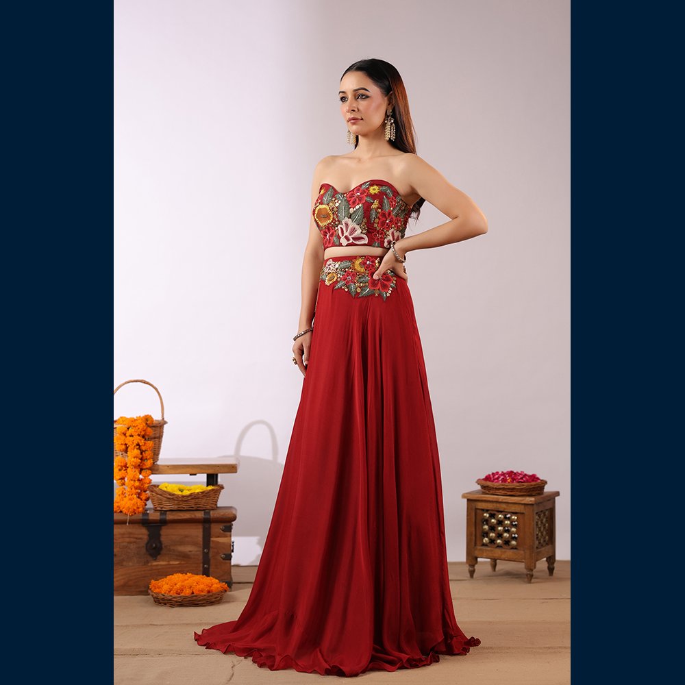 • 🌸 Vibrant floral embroidered bustier adding a modern–traditional charm.