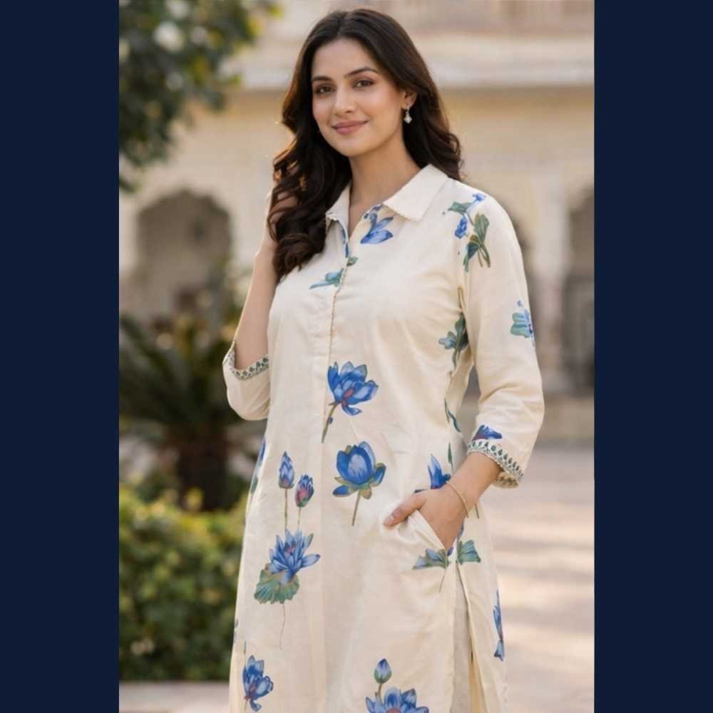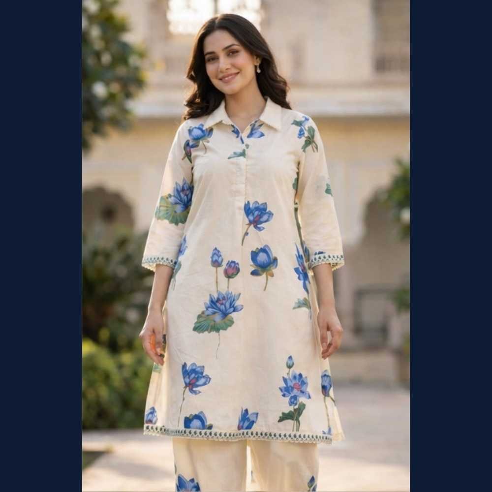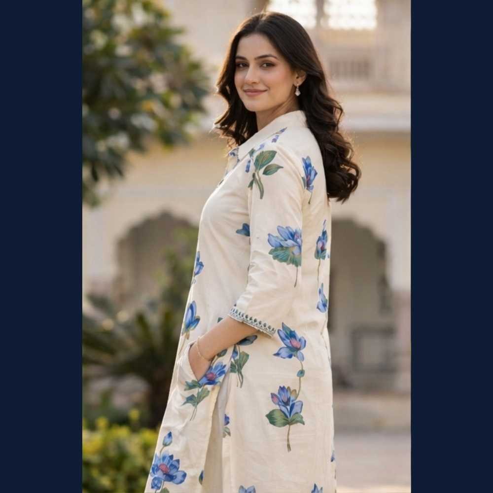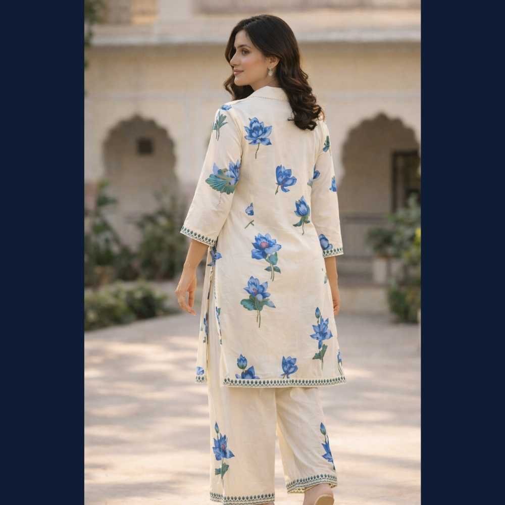 Pair this lotus printed kurta set with silver or pearl jewellery and nude heels or flats. Add a soft tote bag for a relaxed yet elegant daytime look. ✨