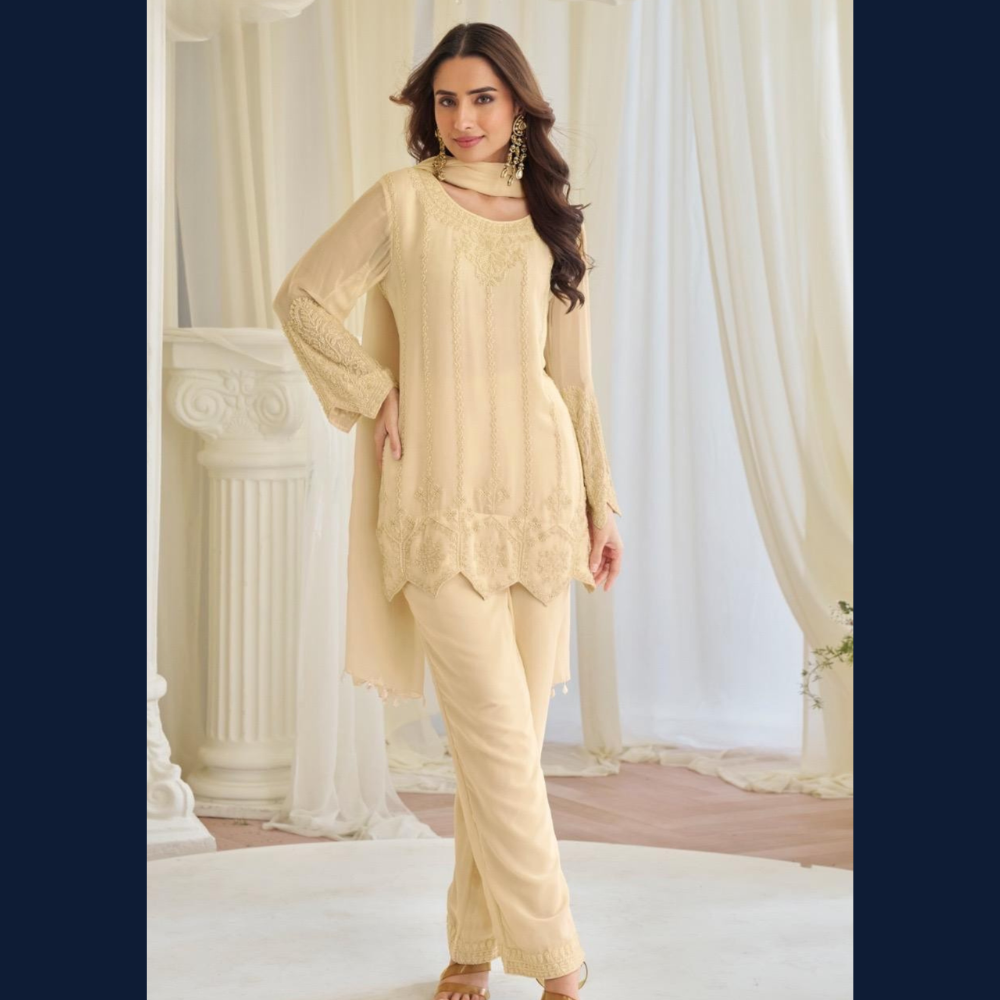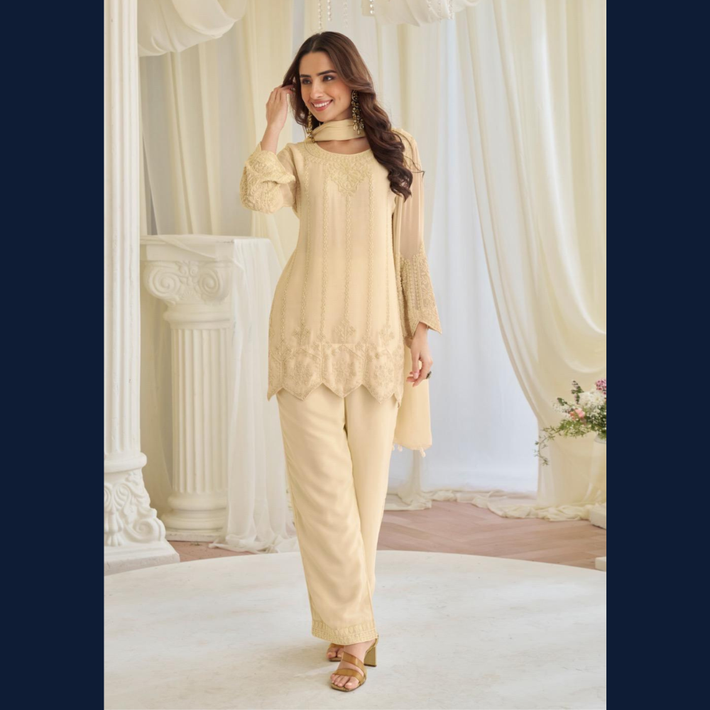 💛 Graceful ivory kurta set featuring delicate tone-on-tone embroidery for a timeless look