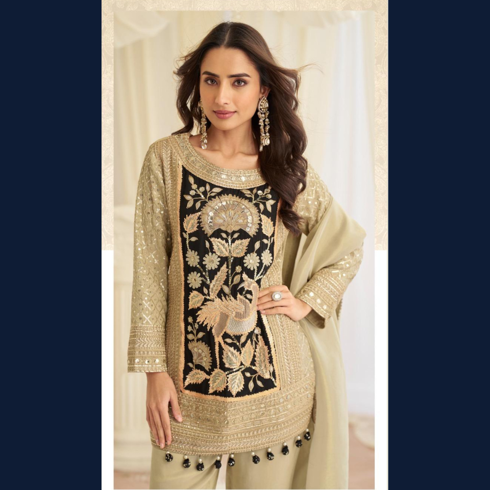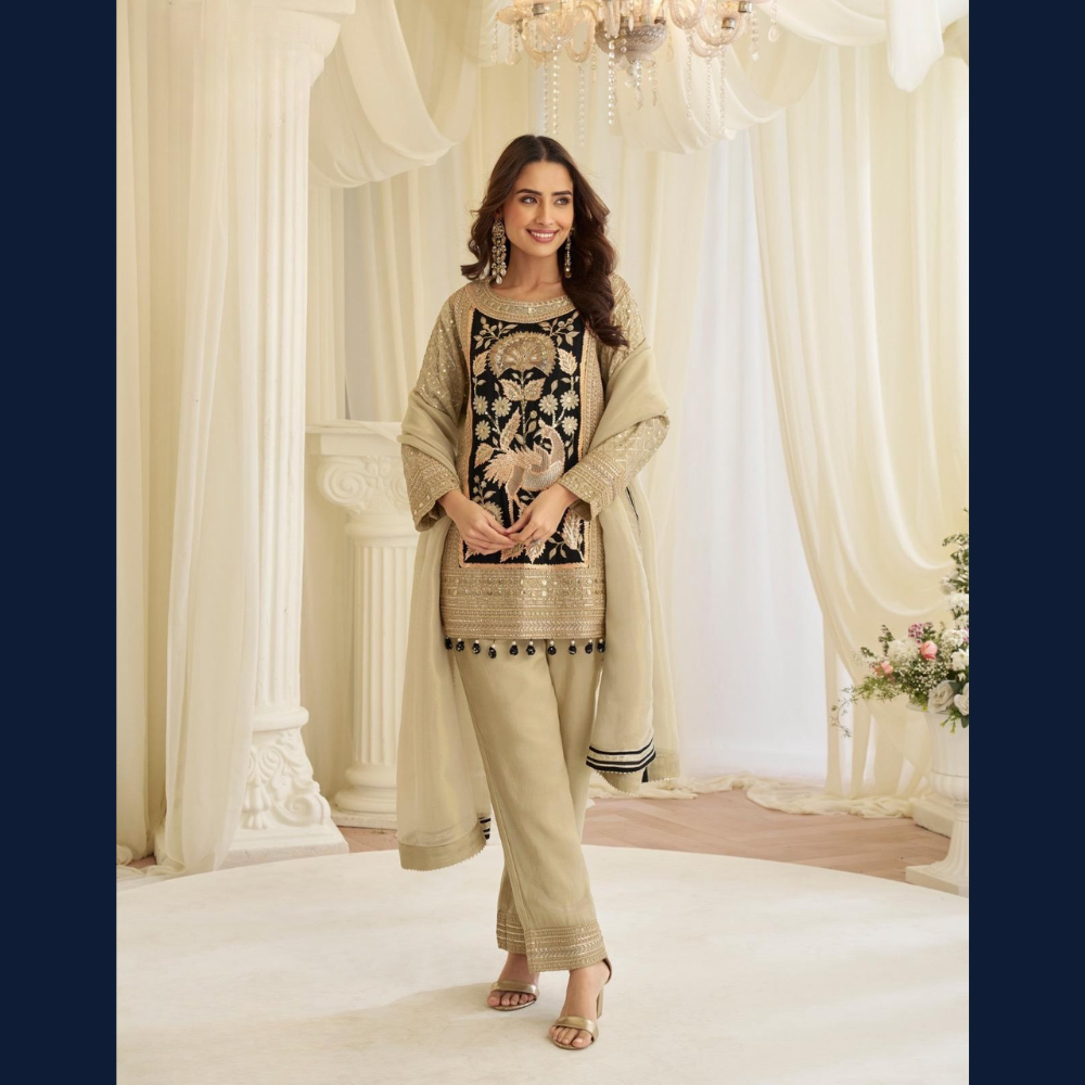 🤎 Elegant beige & black embroidered kurta with rich zari detailing