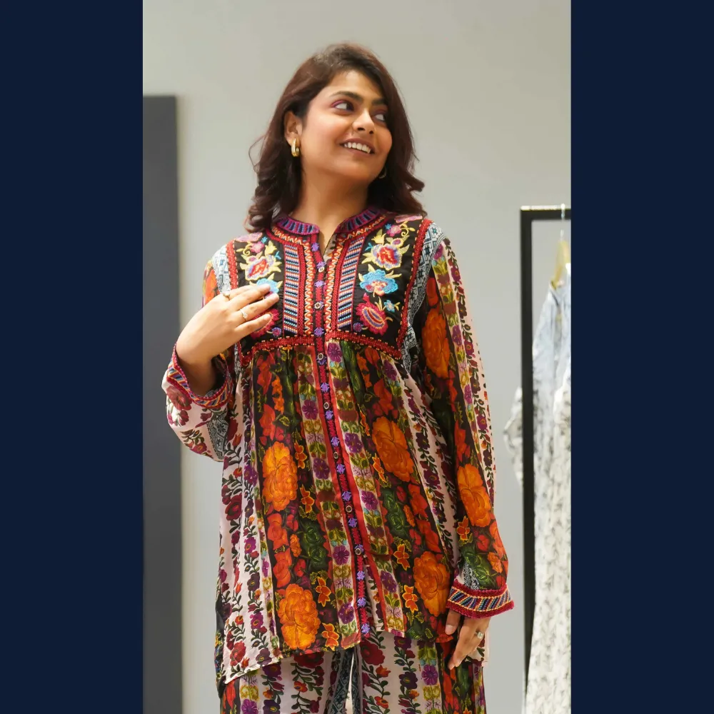 • 🧵 Intricate embroidered yoke with vibrant thread detailing