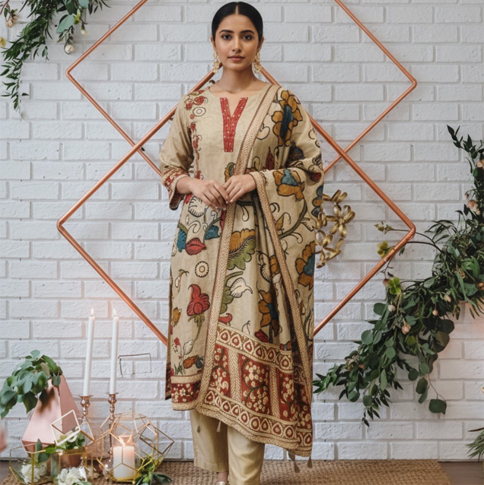 Beige kurta adorned with bold, multicoloured folk-inspired floral motifs 🌸