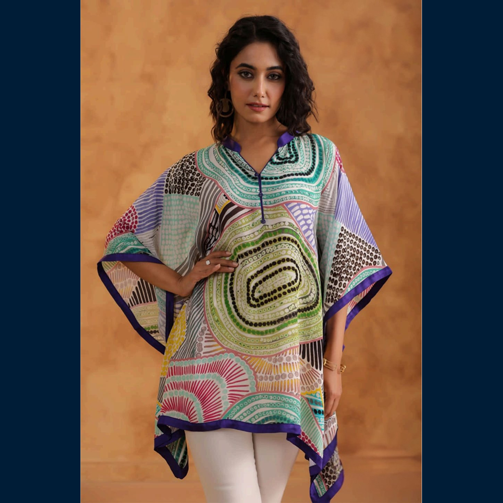 A flowy kaftan-style top splashed with bold geometric and abstract patterns — basically wearable art 🎨✨