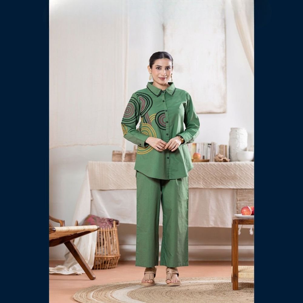 💚 Elegant emerald green co-ord set with modern artistic prints