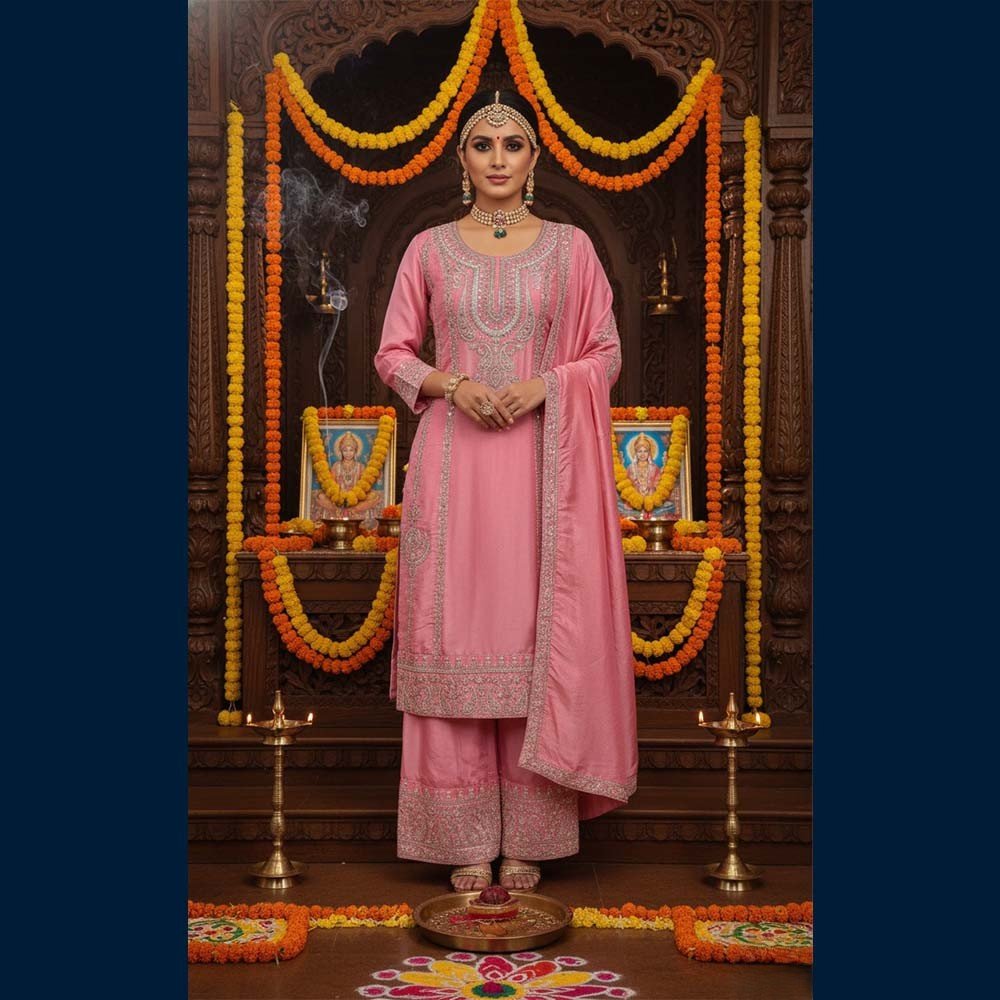 Go for a sleek bun, chandbalis, and soft glam makeup—this set gives “elegant bahu entering the mandir with full blessings mode” vibes 🌸✨