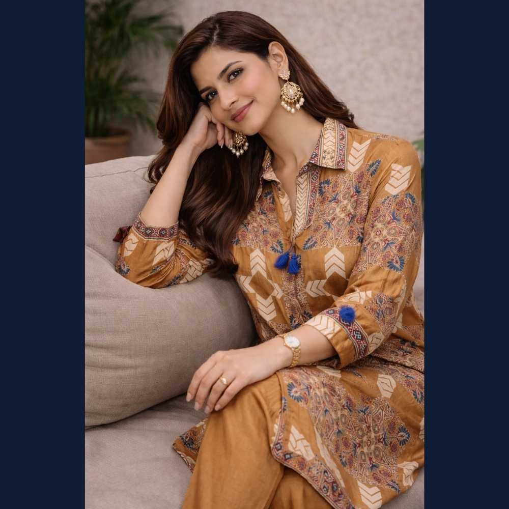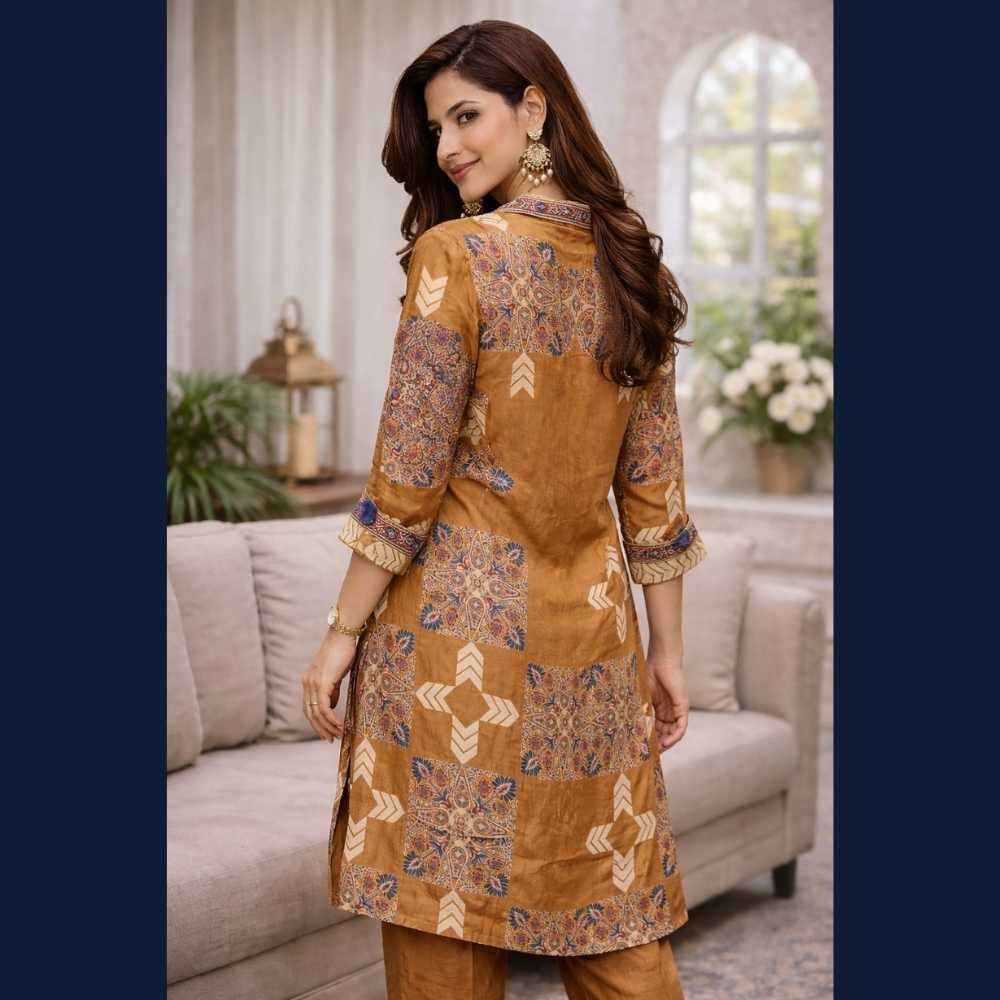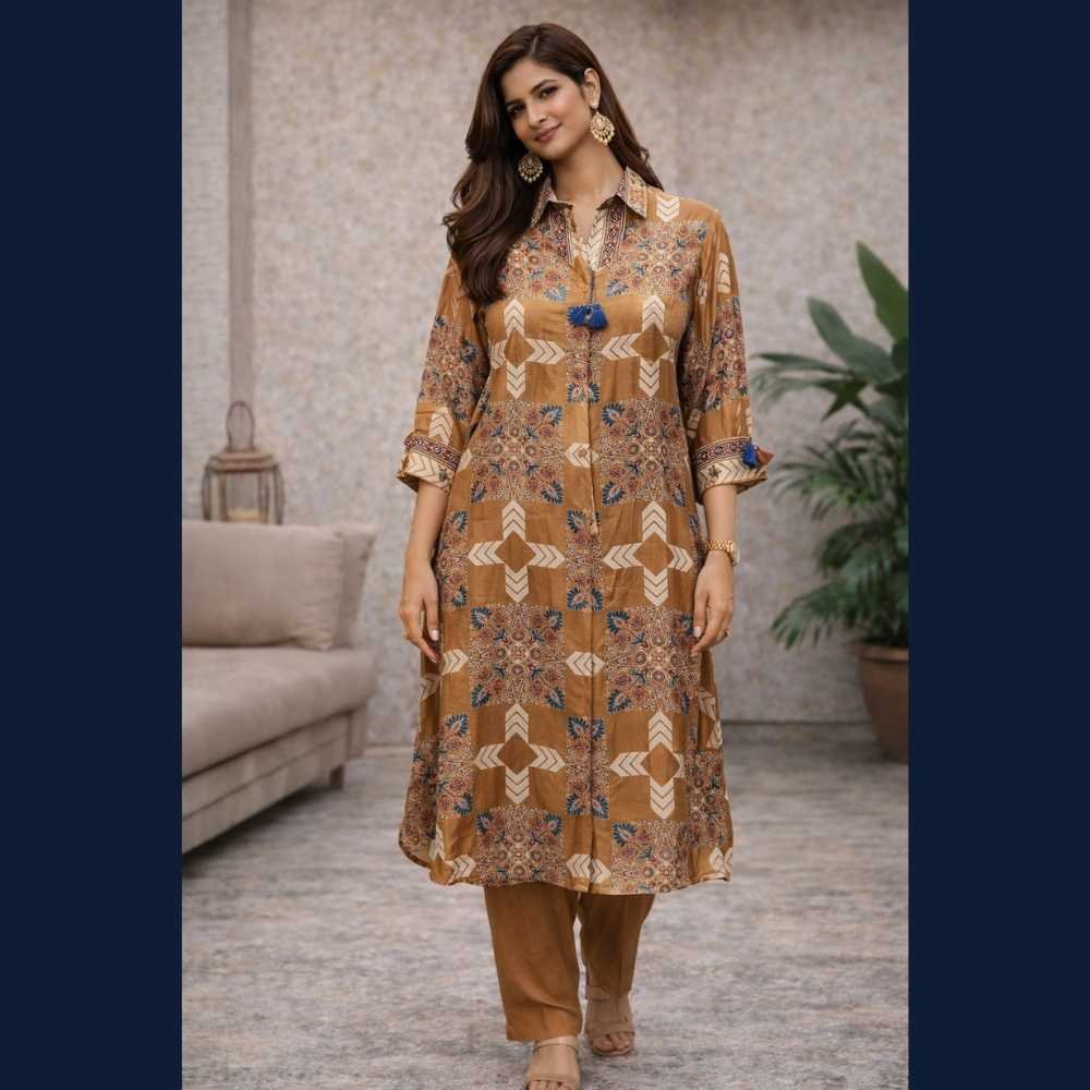🤎 Elegant printed shirt-style kurta with pants designed for a contemporary ethnic look