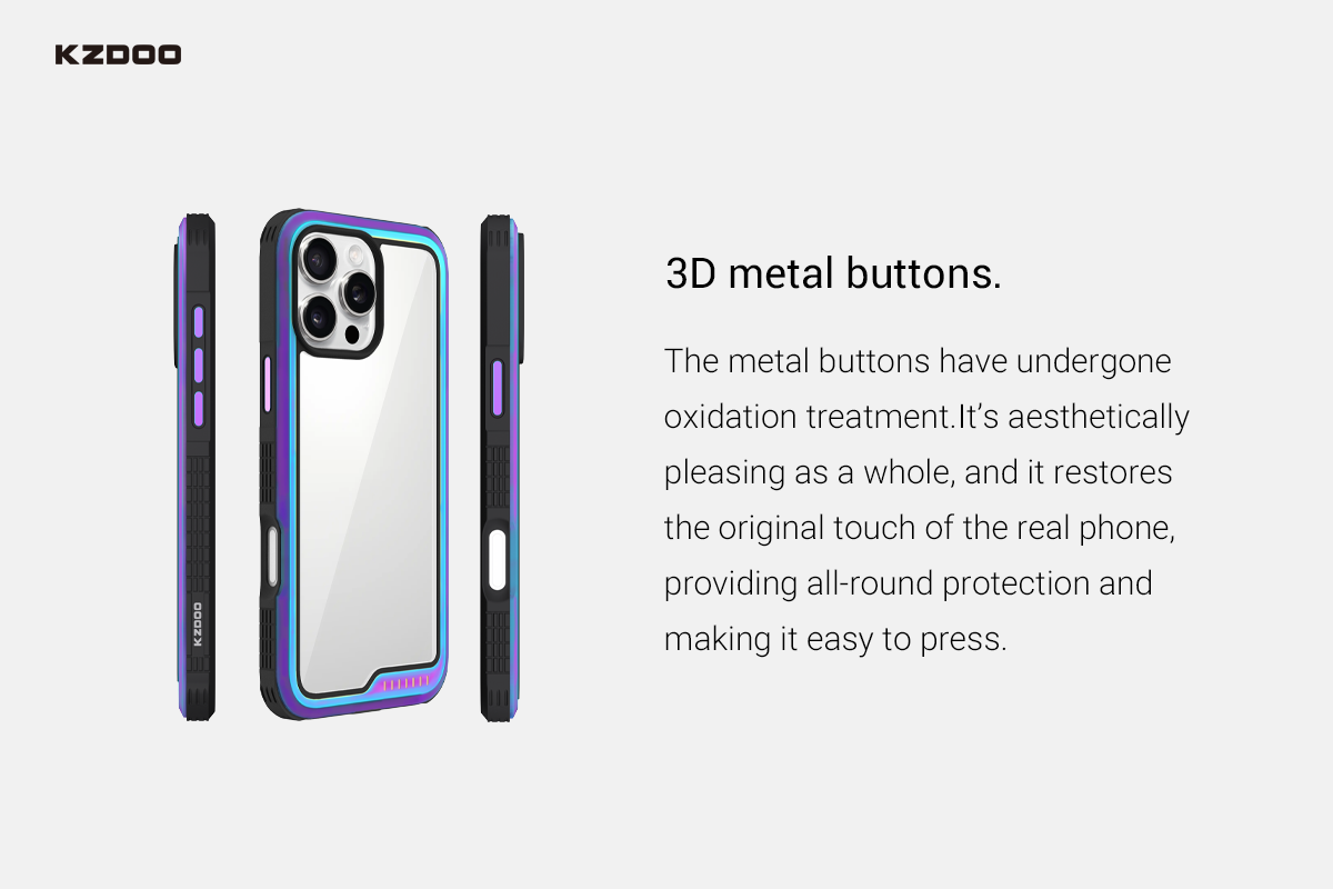 Tactile button covers for volume and power – color-matched with the case frame.