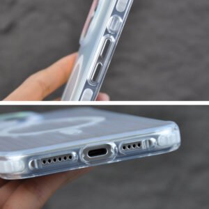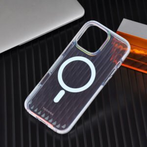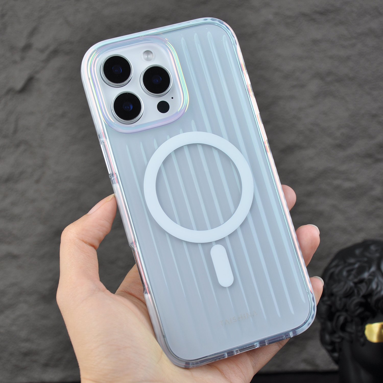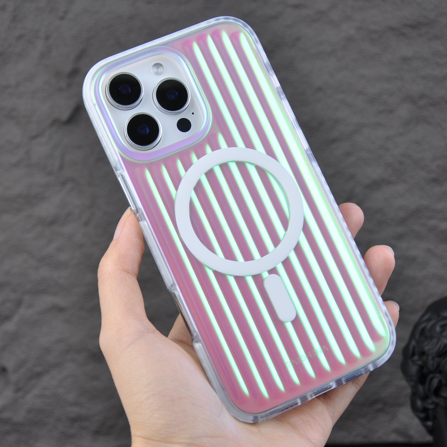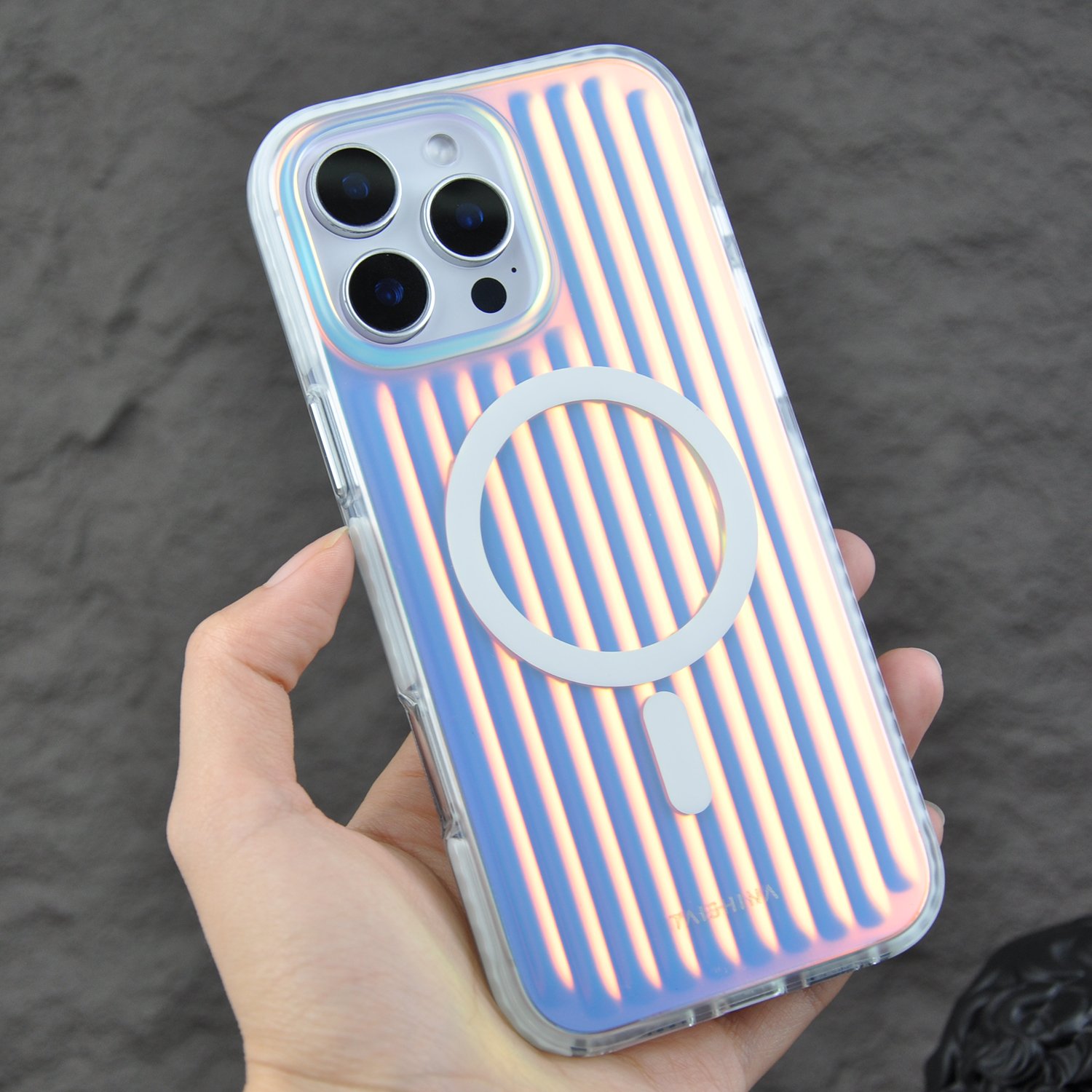 > The back has a ribbed, vertical striped texture, giving it a rugged suitcase-like appearance for added grip and style.