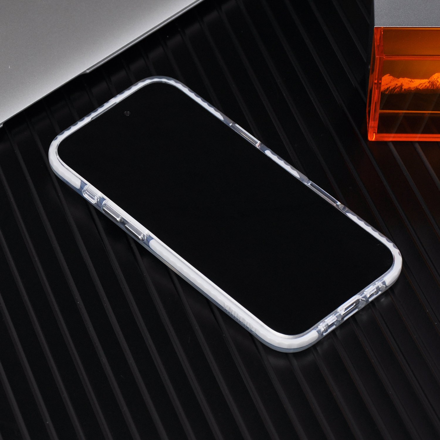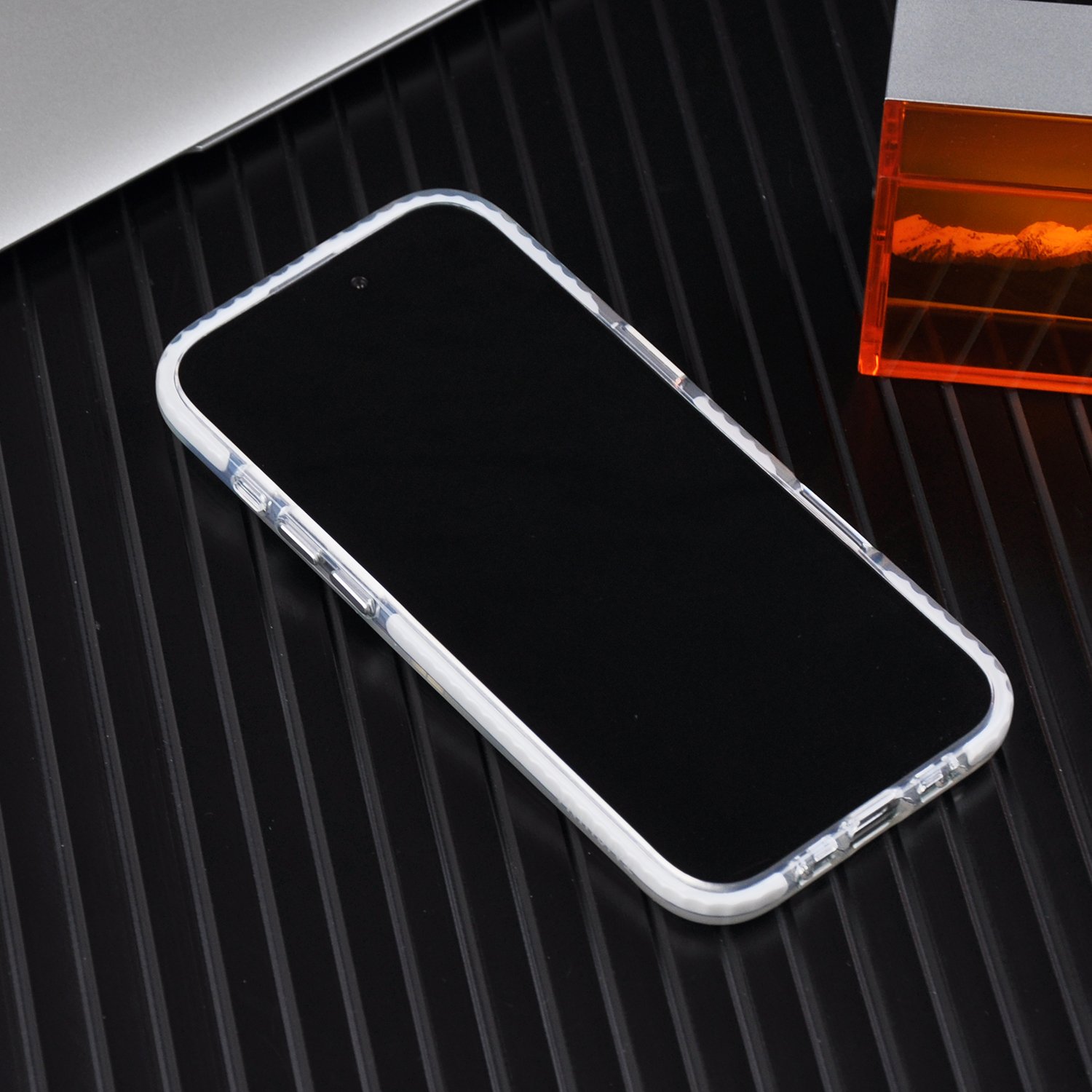 - The sides appear to be made of TPU (thermoplastic polyurethane), which is flexible and absorbs shocks.