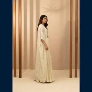 Pair with pearl or gold-toned earrings and minimal heels. Ideal for festive soirées, mehendi brunches, or modern celebrations—soft glam, timeless grace, zero fuss.