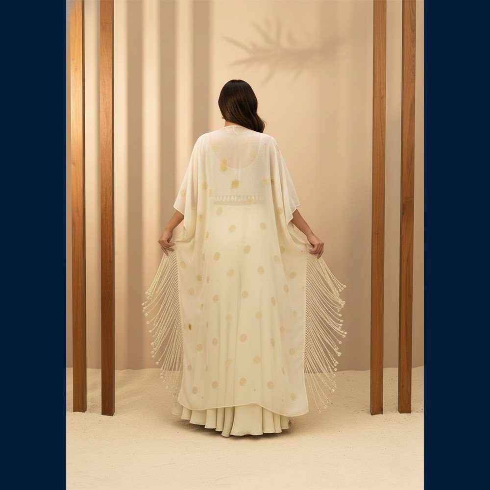 🌬️ Sheer cape overlay with subtle polka accents and tassel fringes.