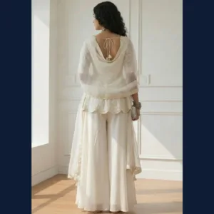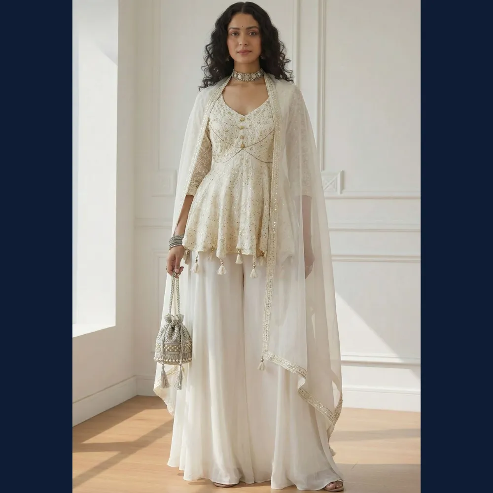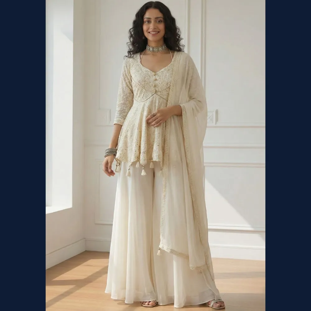 🤍 Elegant ivory three-piece festive set crafted for timeless sophistication