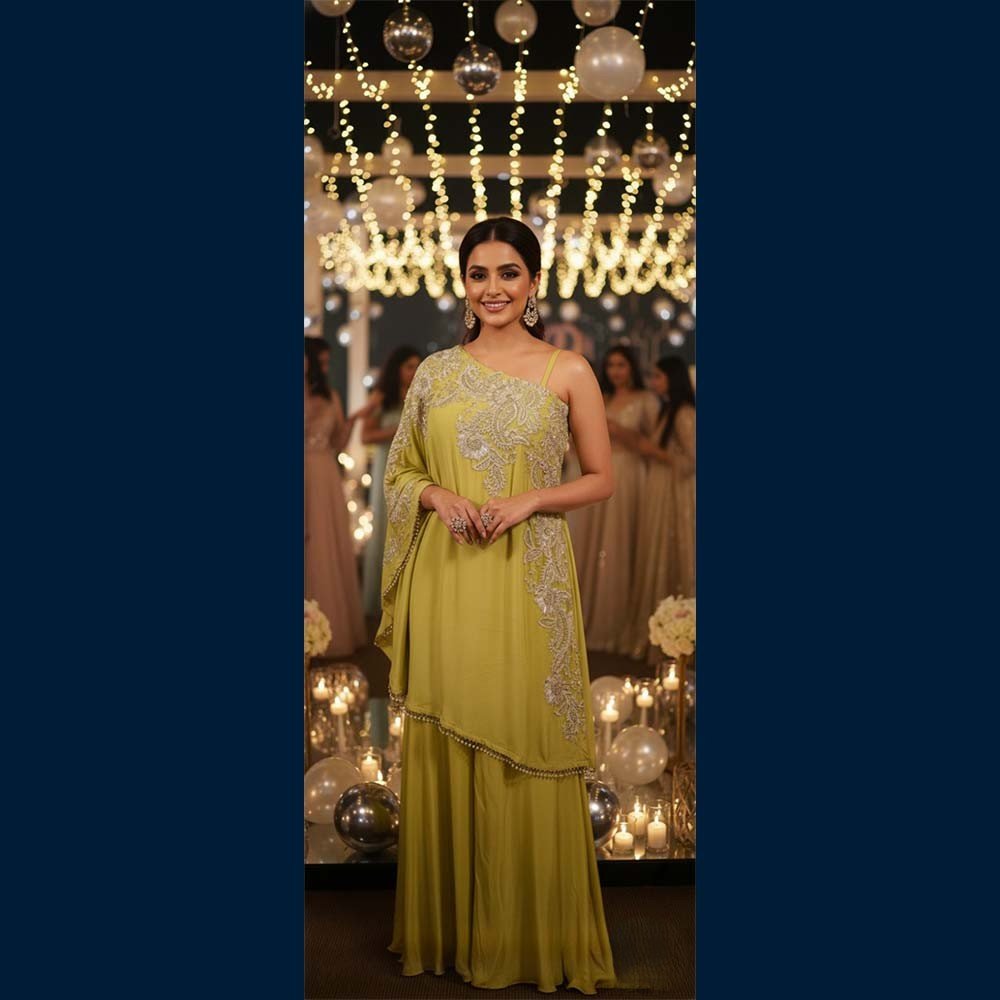 A stunning one-shoulder lime drape set that brings fresh, festive energy to every celebration 💛✨