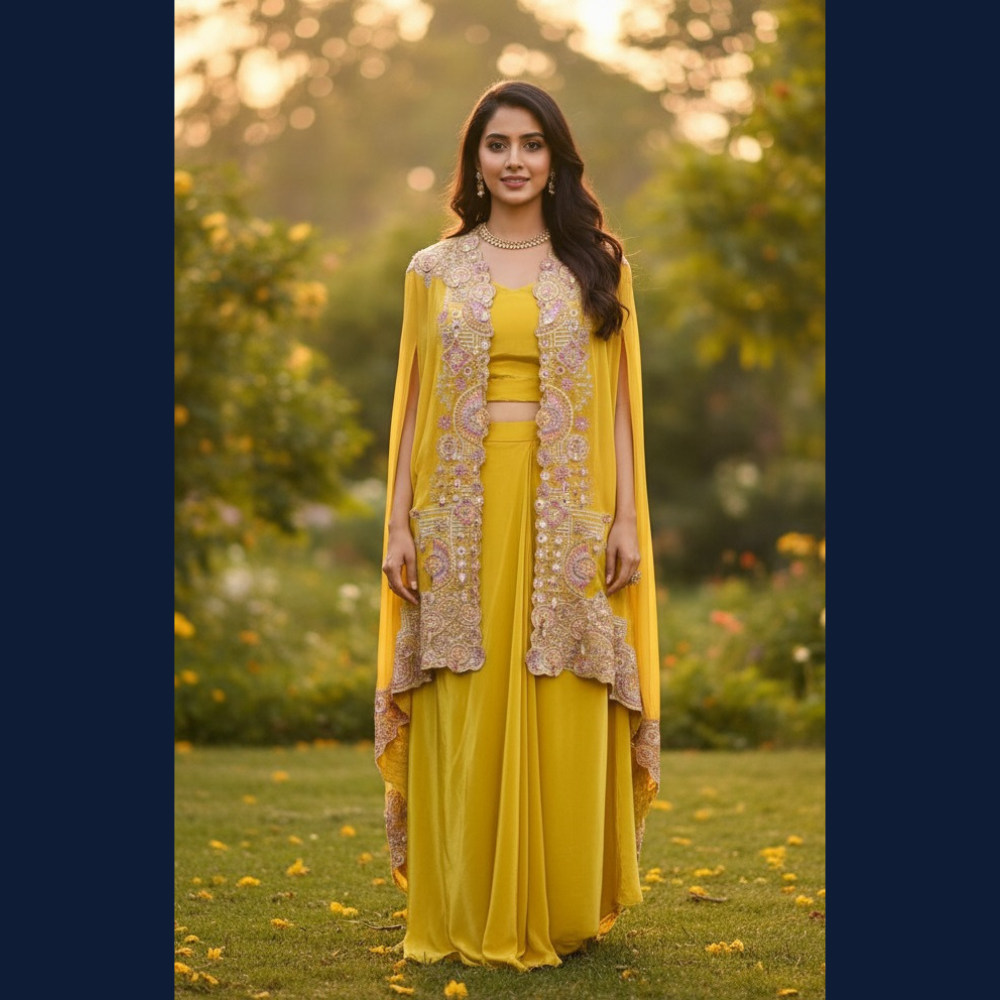 Soft, flowy fabric that moves like a dream — perfect for haldi, daytime weddings, and garden celebrations