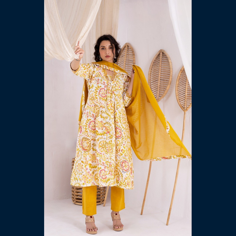 Vibrant floral-printed kurta in white + mustard for a cheerful daytime charm ☀️🌸