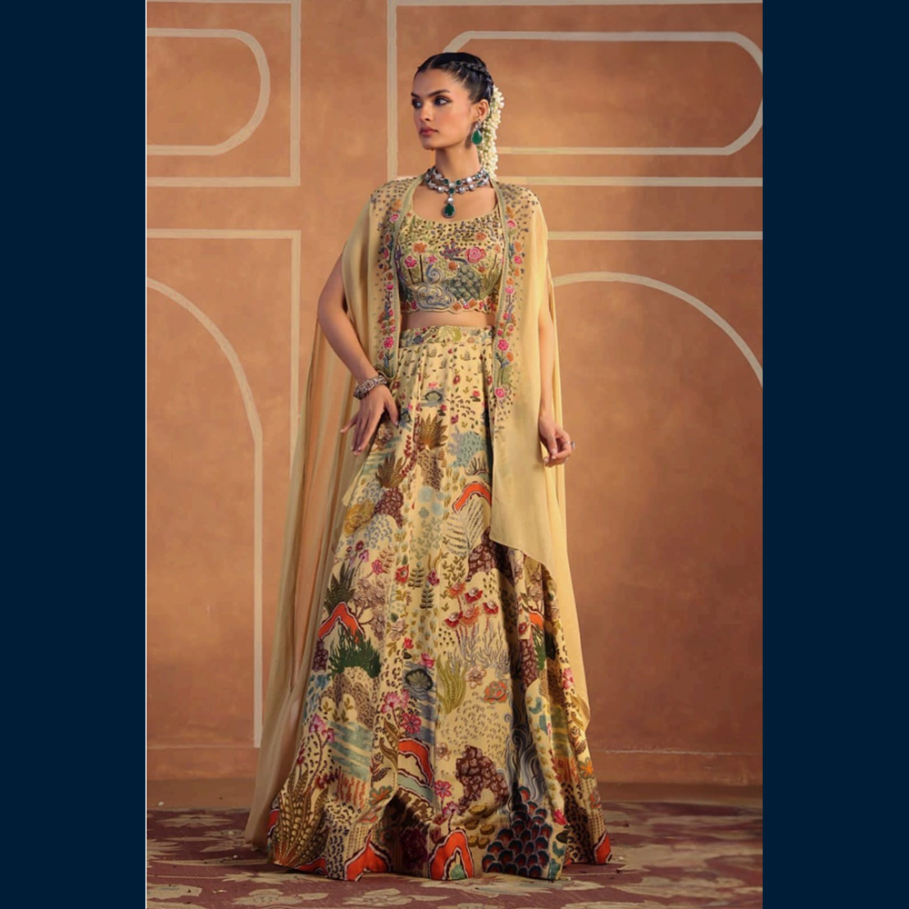 Flowing lehenga showcases multi-toned embroidered scenes, making it a true statement piece for heritage-loving fashion queens