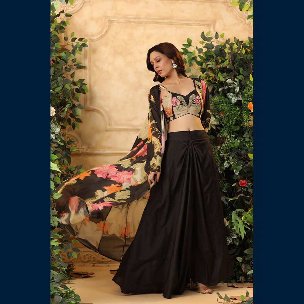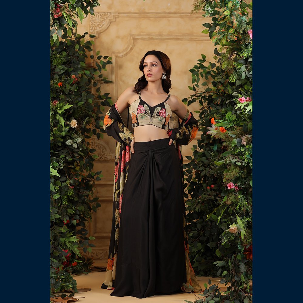 • Black wide-leg pants paired with a vibrant embroidered bustier for a statement look 🌺🖤