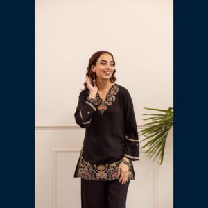 • 🖤 Classic black kurta highlighted with floral embroidery on the neckline and hem.