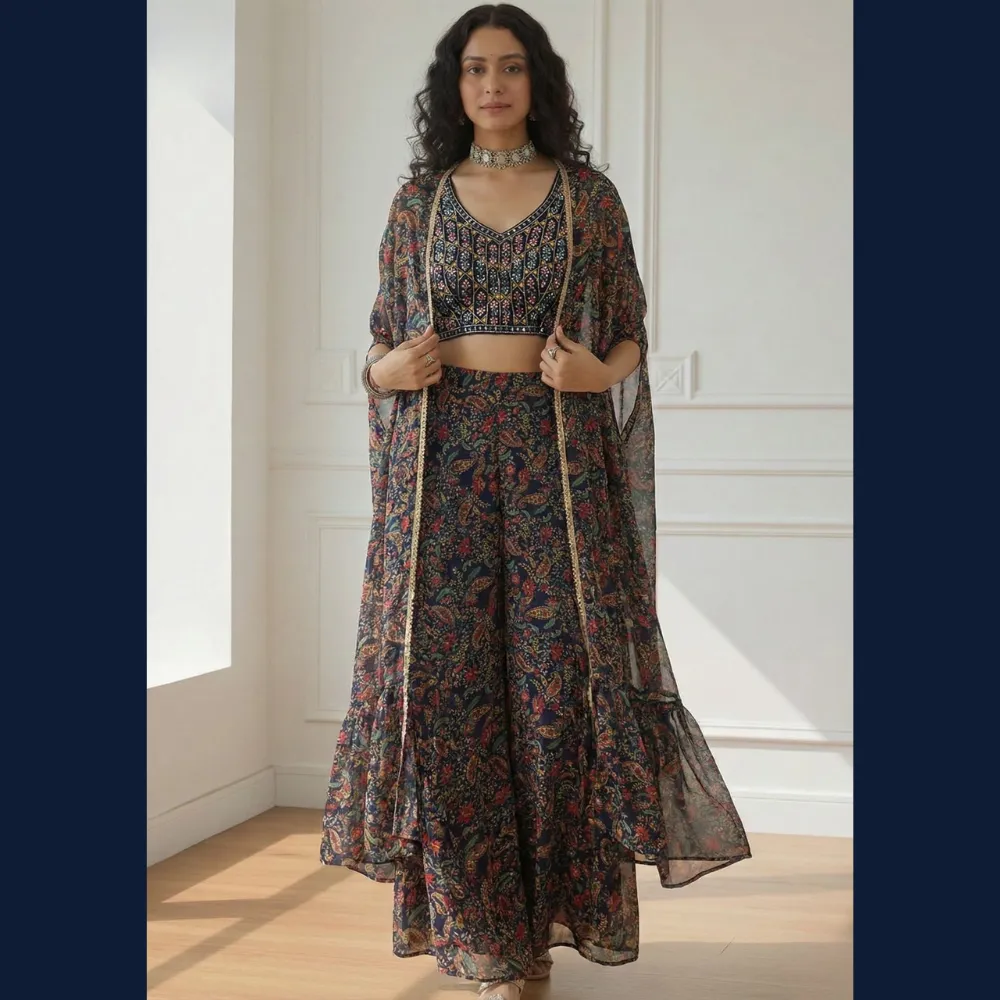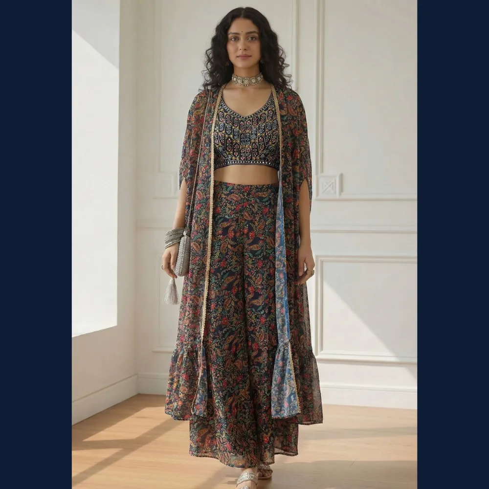 🌙 Elegant three-piece fusion set featuring a printed bralette-style blouse