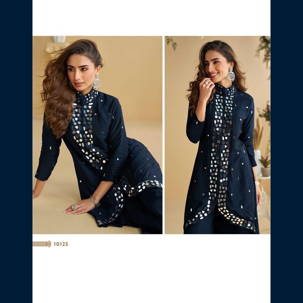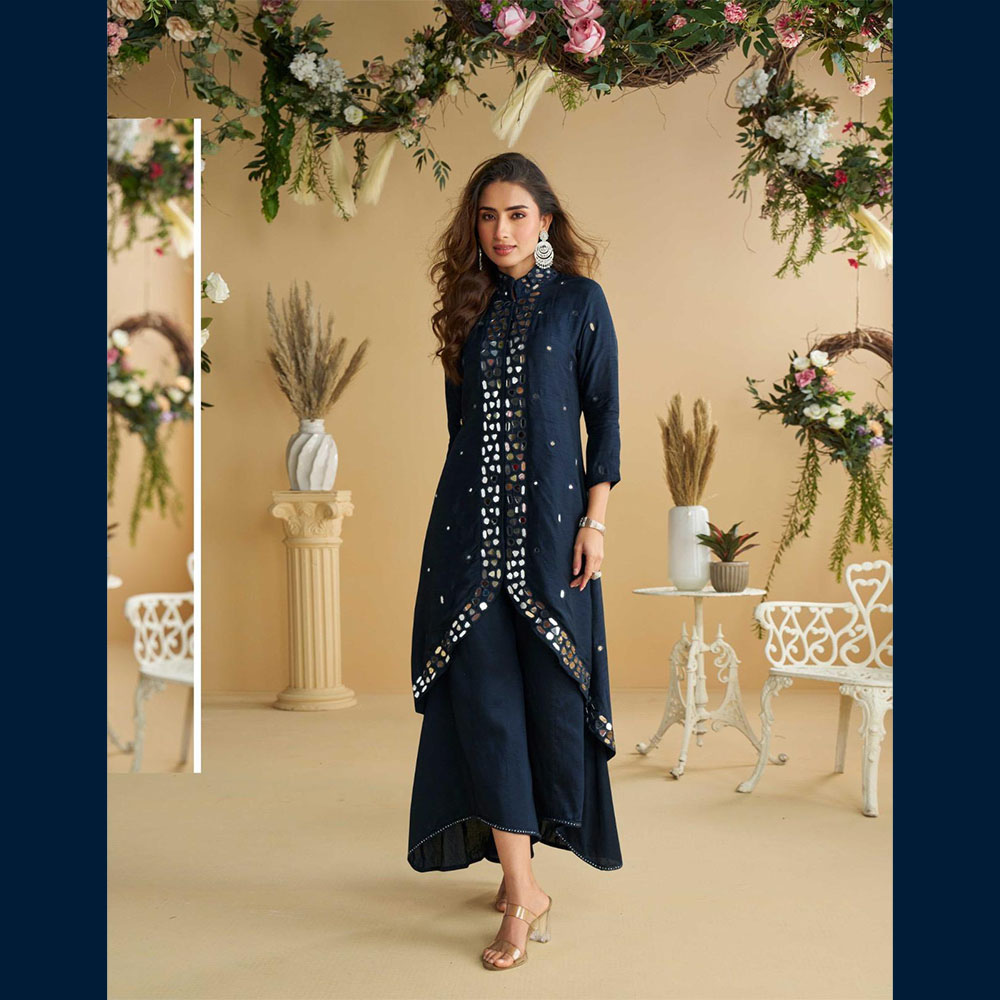 • 🖤 Deep navy blue kurta with elegant mirror embellishments
