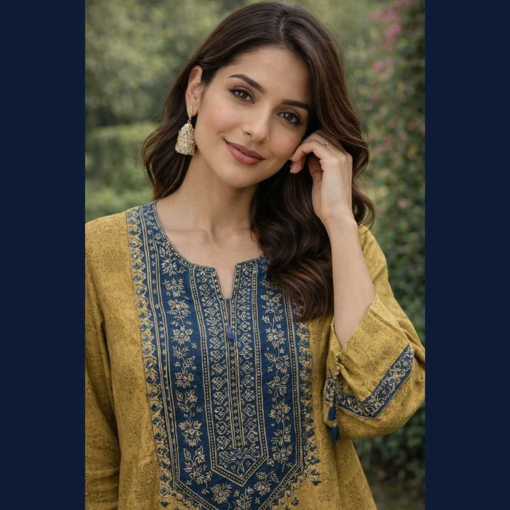 Pair this mustard kurta set with oxidized silver or antique gold jewellery and neutral heels or traditional juttis. Style your hair in soft waves for a refined daytime ethnic look. ✨
