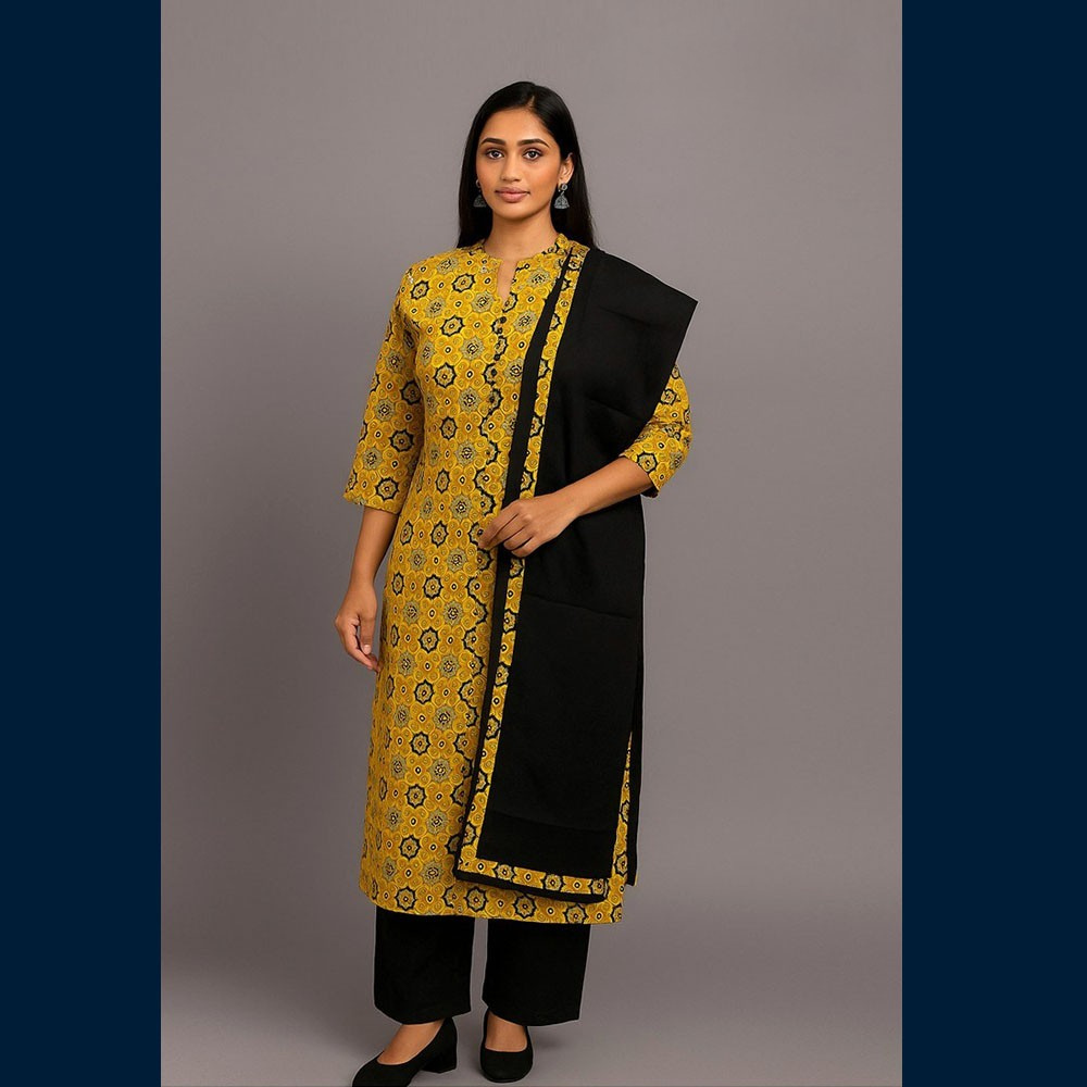 • 💛 Mustard yellow kurta with classic all-over traditional print
