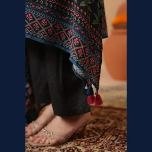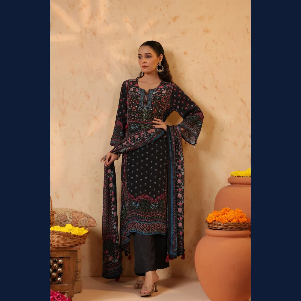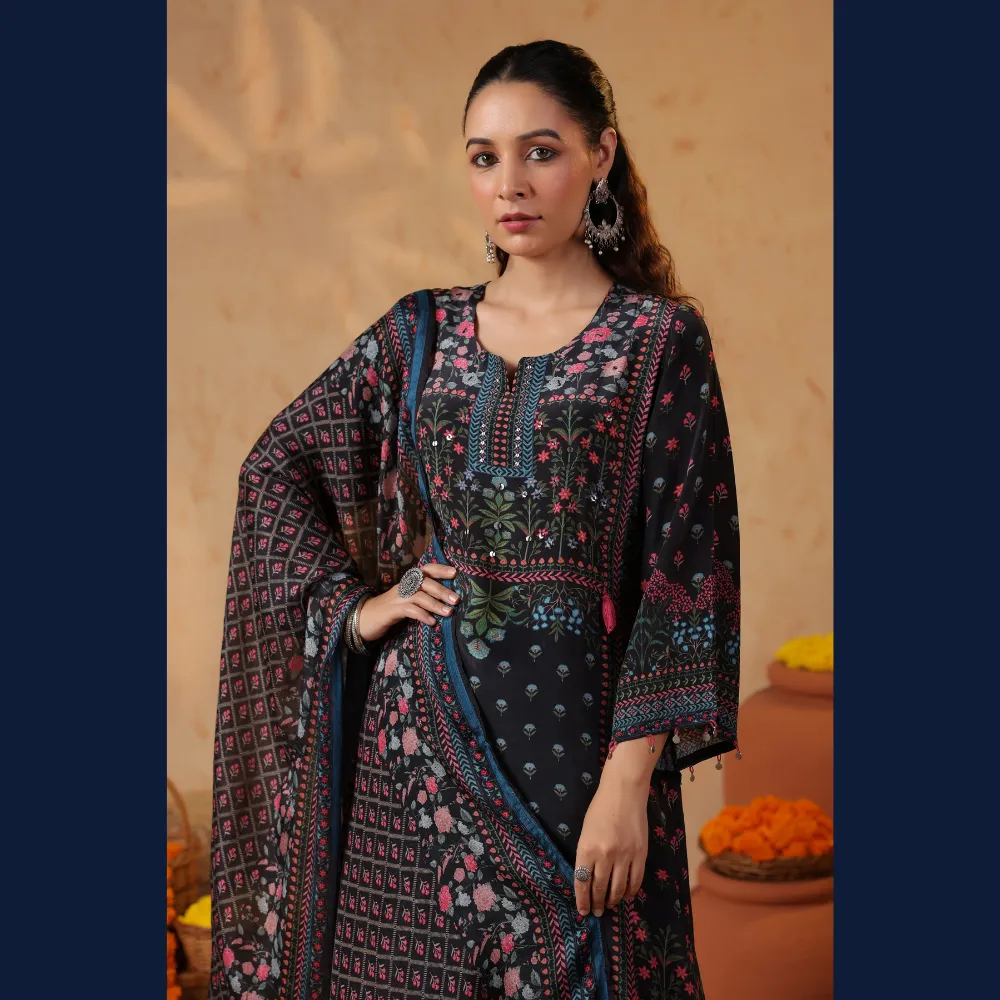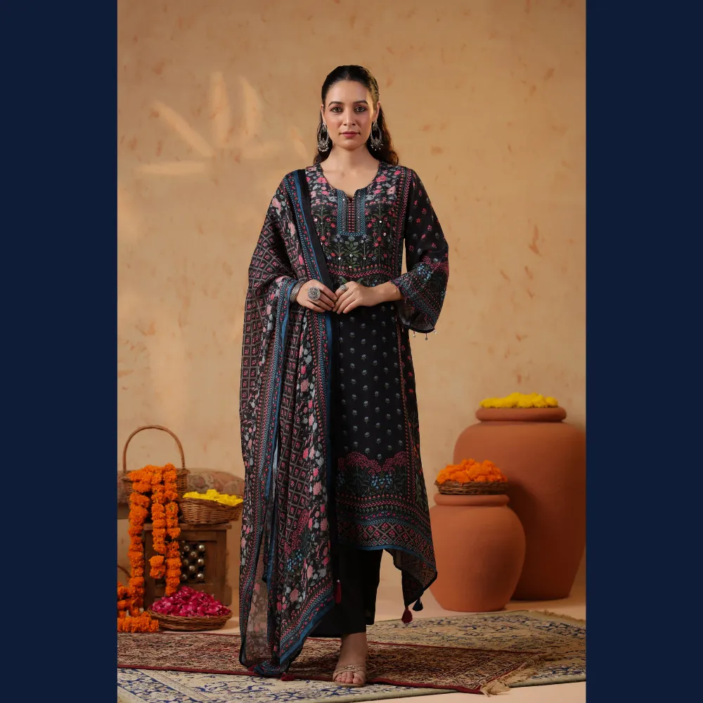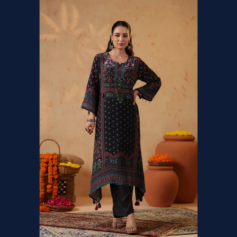 • 🌸 Rich black base with multicolor ethnic prints