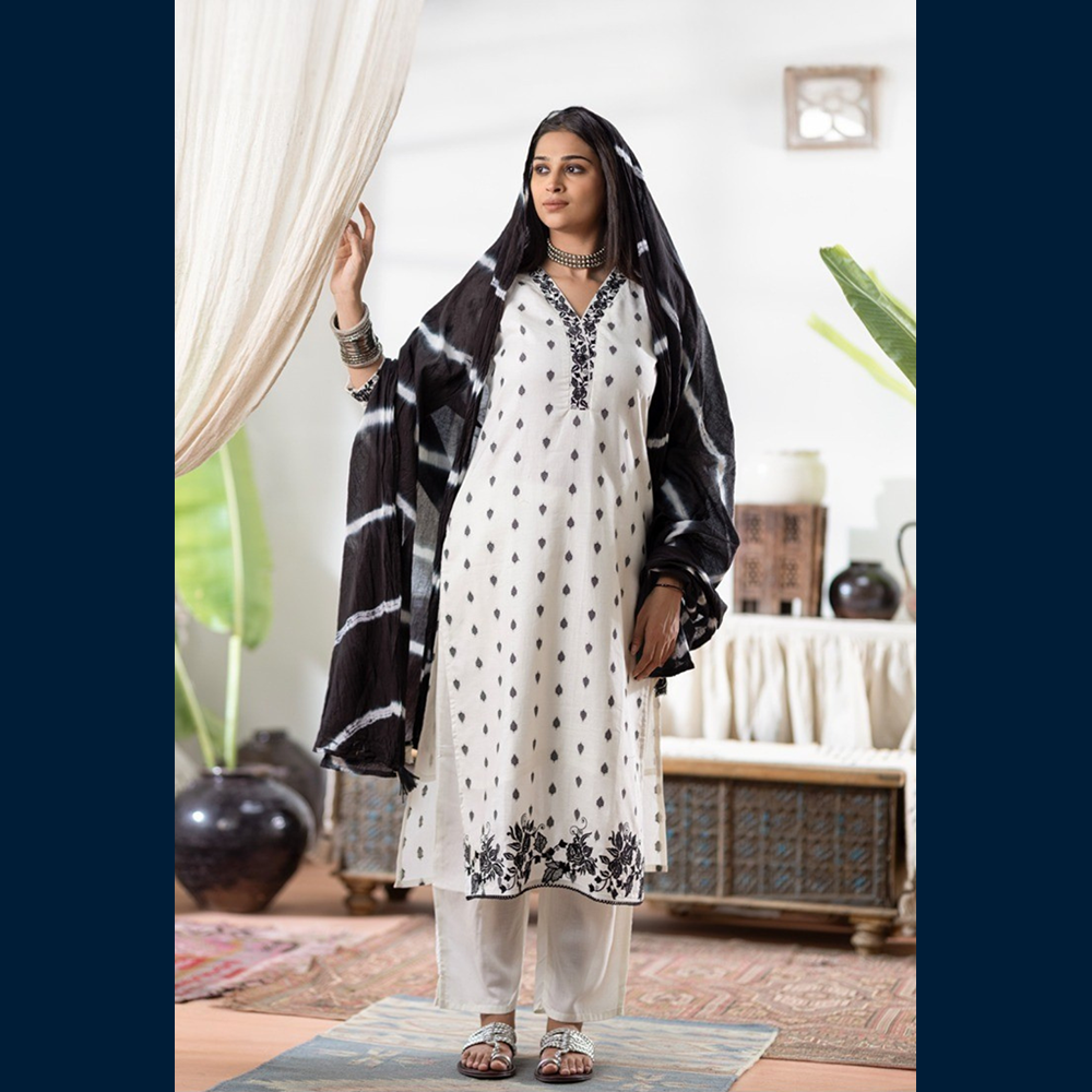 Beautifully embroidered neckline in black threadwork that instantly elevates the whole silhouette