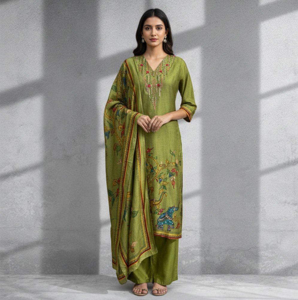 Rich olive kurta featuring delicate threadwork with pops of red and peach embroidery 🎨