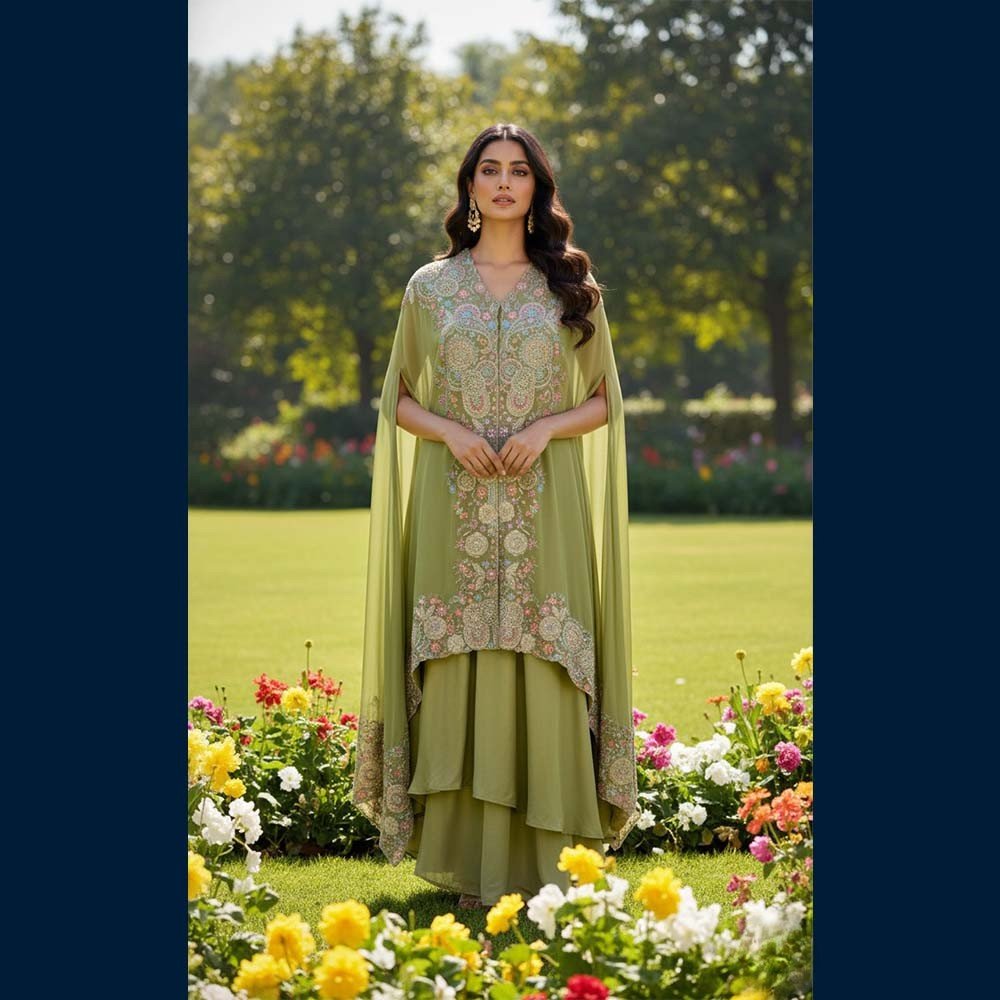 A serene olive green cape set blooming with intricate multicolour thread and sequin embroidery — soft, dreamy, and oh-so-elegant 🌿