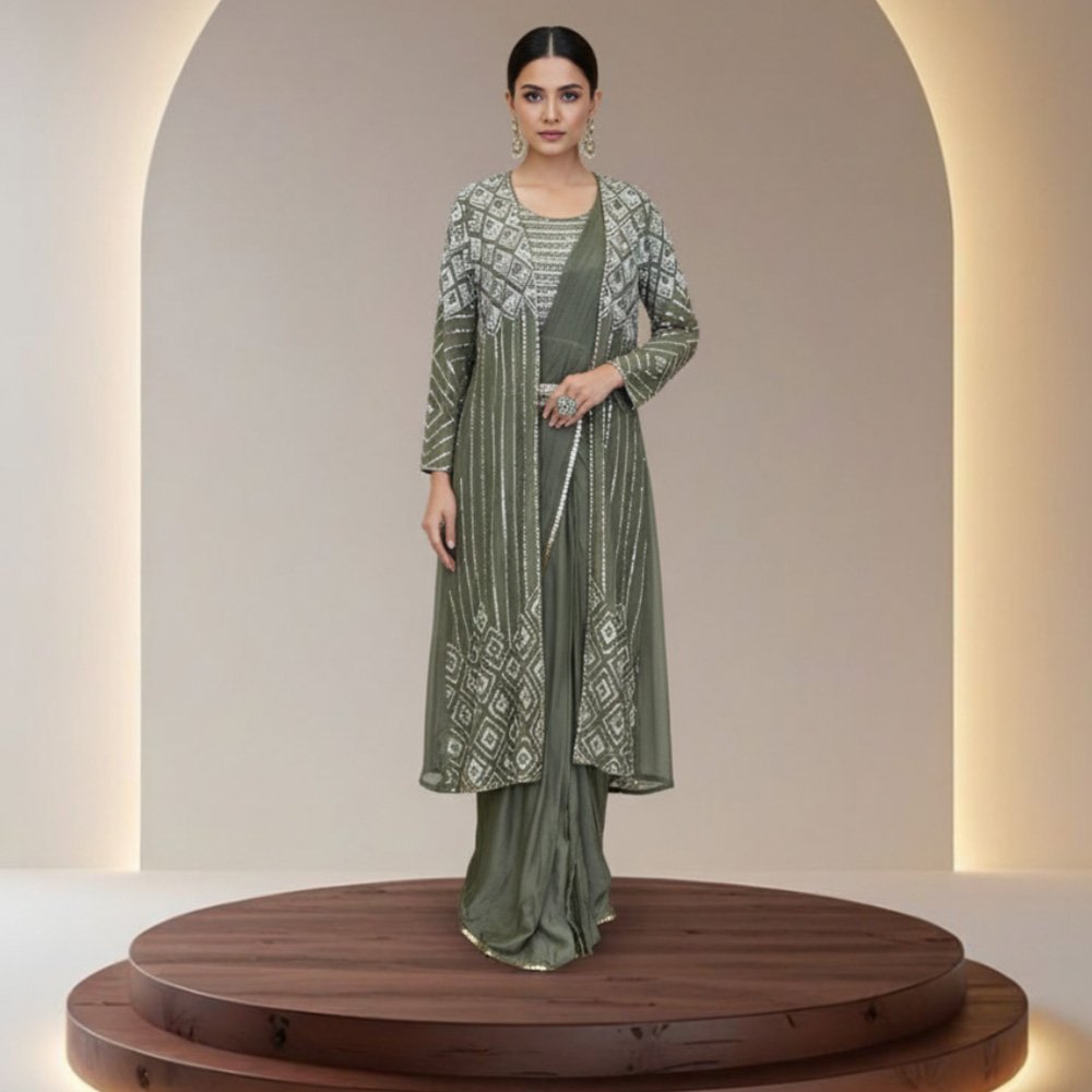 Luxe olive drape paired with a beautifully embellished long jacket for a regal silhouette 💫