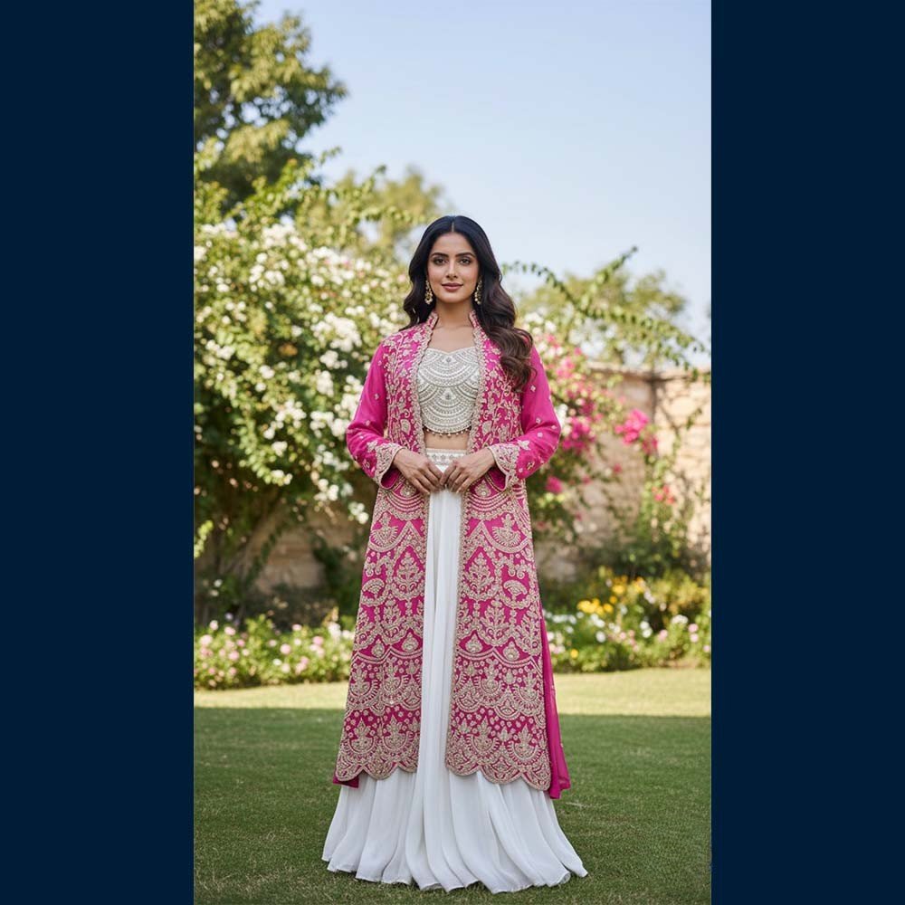 A show-stopping rani pink long jacket drenched in regal zardosi-style embroidery ✨💗