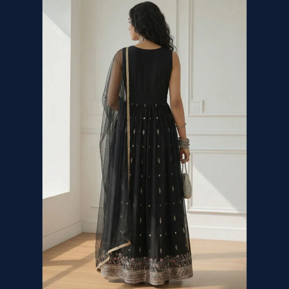 🧣 Sheer black dupatta with gold edging completing the graceful ensemble