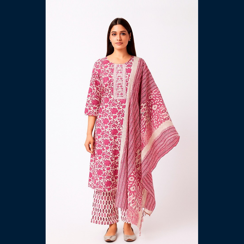 • Pink floral-printed kurta with a beautifully detailed embroidered yoke for that graceful ethnic charm 🌸✨