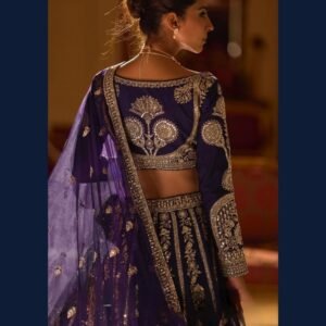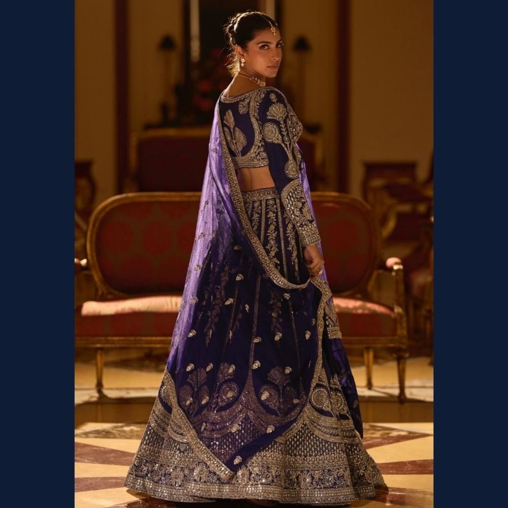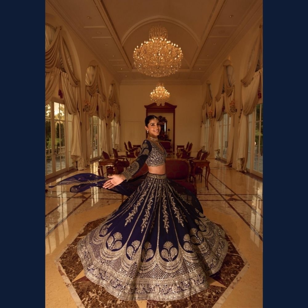 Pair this royal navy lehenga with statement kundan or diamond jewellery and embellished heels. Style your hair in a sleek bun or soft curls with bold eyes and glowing makeup for a majestic bridal-inspired look.