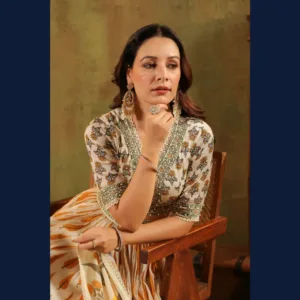 💎 Add statement earrings and soft makeup for a graceful festive look