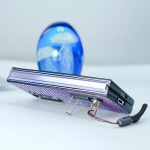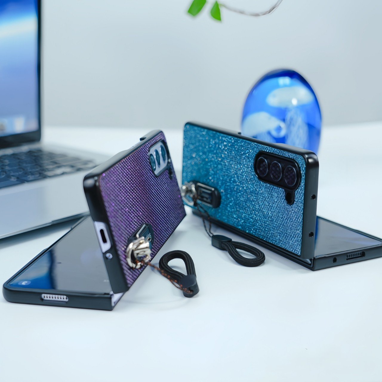 > The case features a diamond-patterned texture that reflects light for a shimmering effect.