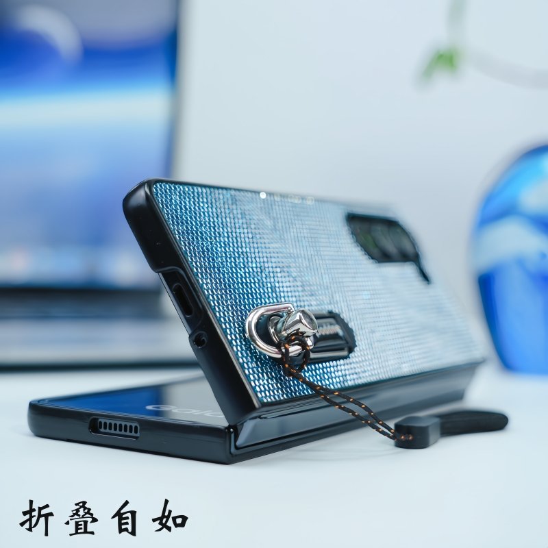 > The side frame is black, made of a metal-polycarbonate blend to match the phone’s hinge and protect it well.