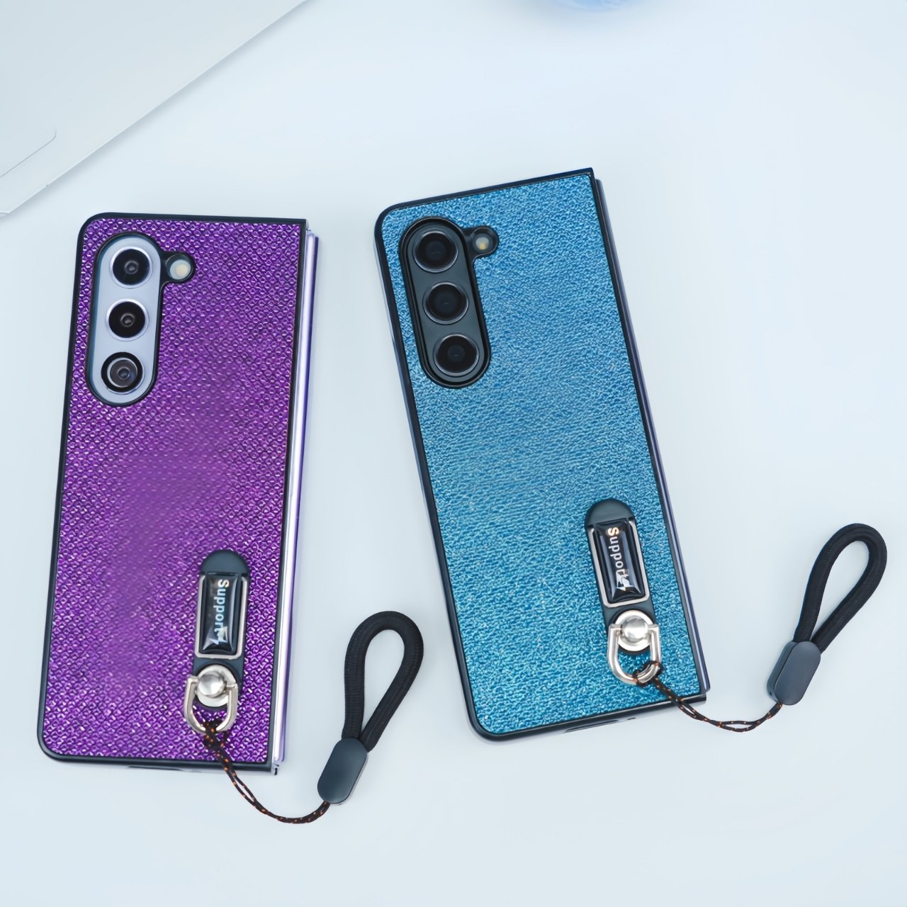 > A metal ring and clip below the stand is connected to a wrist strap, offering additional security when holding or carrying the phone.
