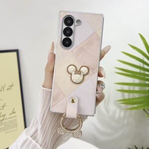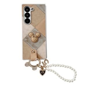 The case features a soft pastel color palette with a patchwork-style pattern, made up of diamond-shaped sections in shades of beige, blush, and cream.