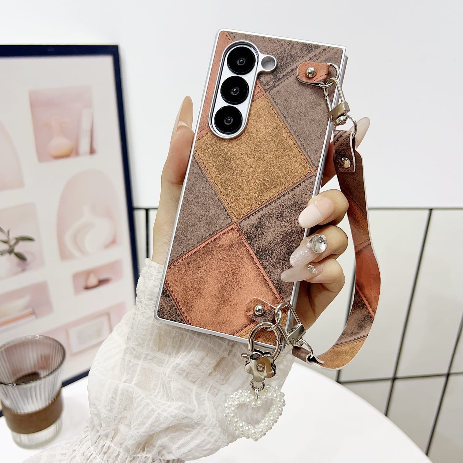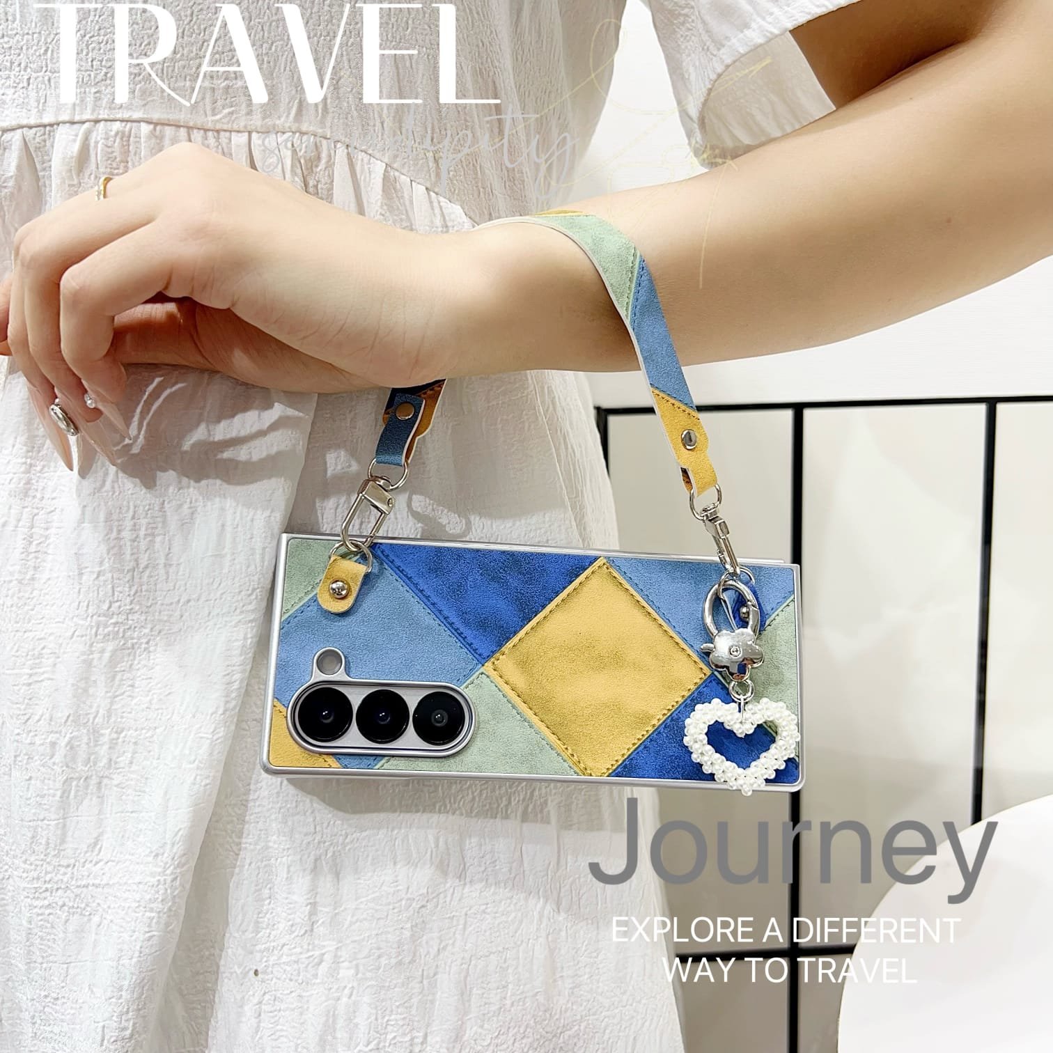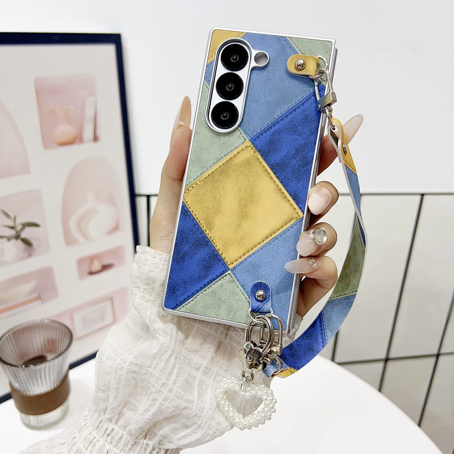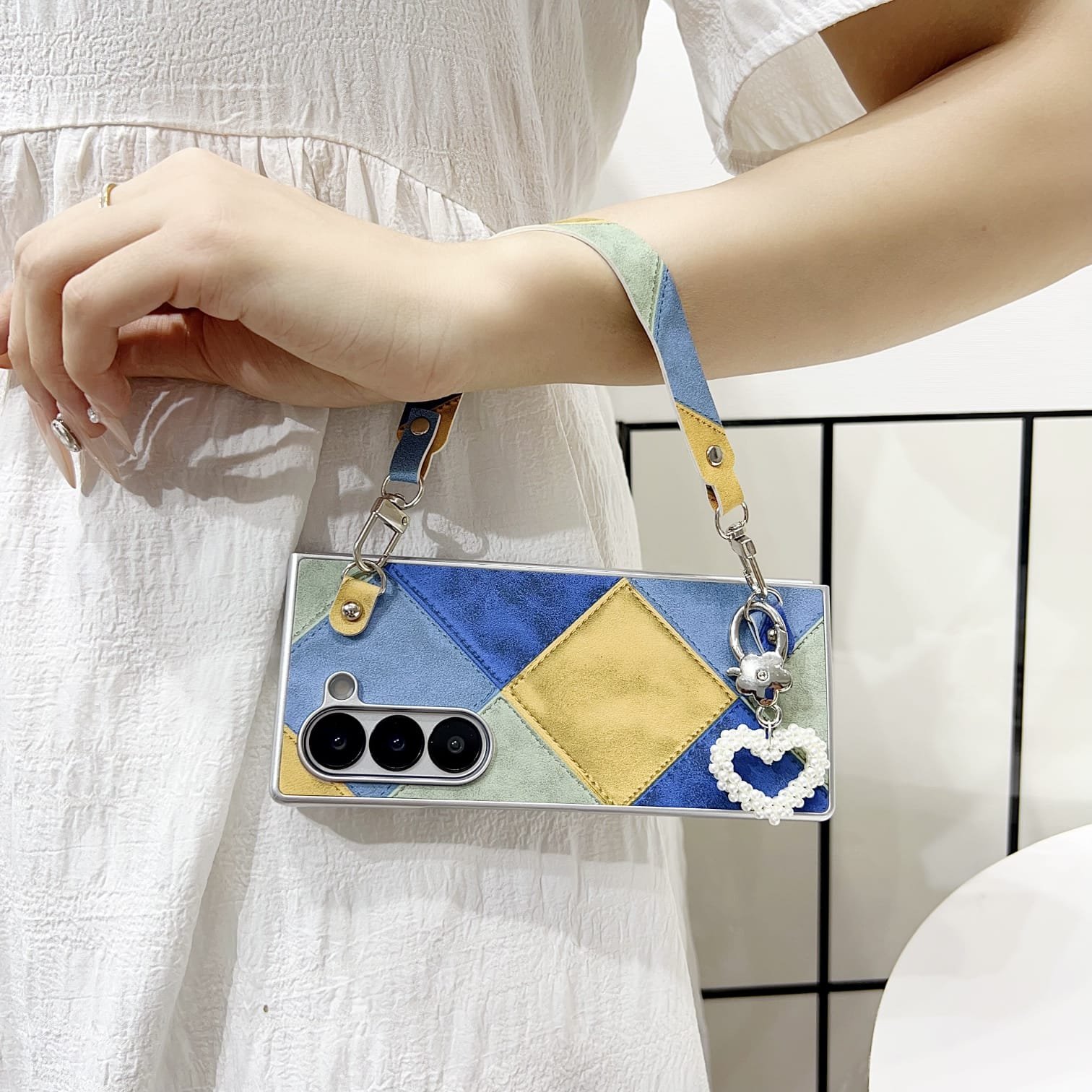 Comes with a detachable matching wrist strap made from the same patchwork fabric.