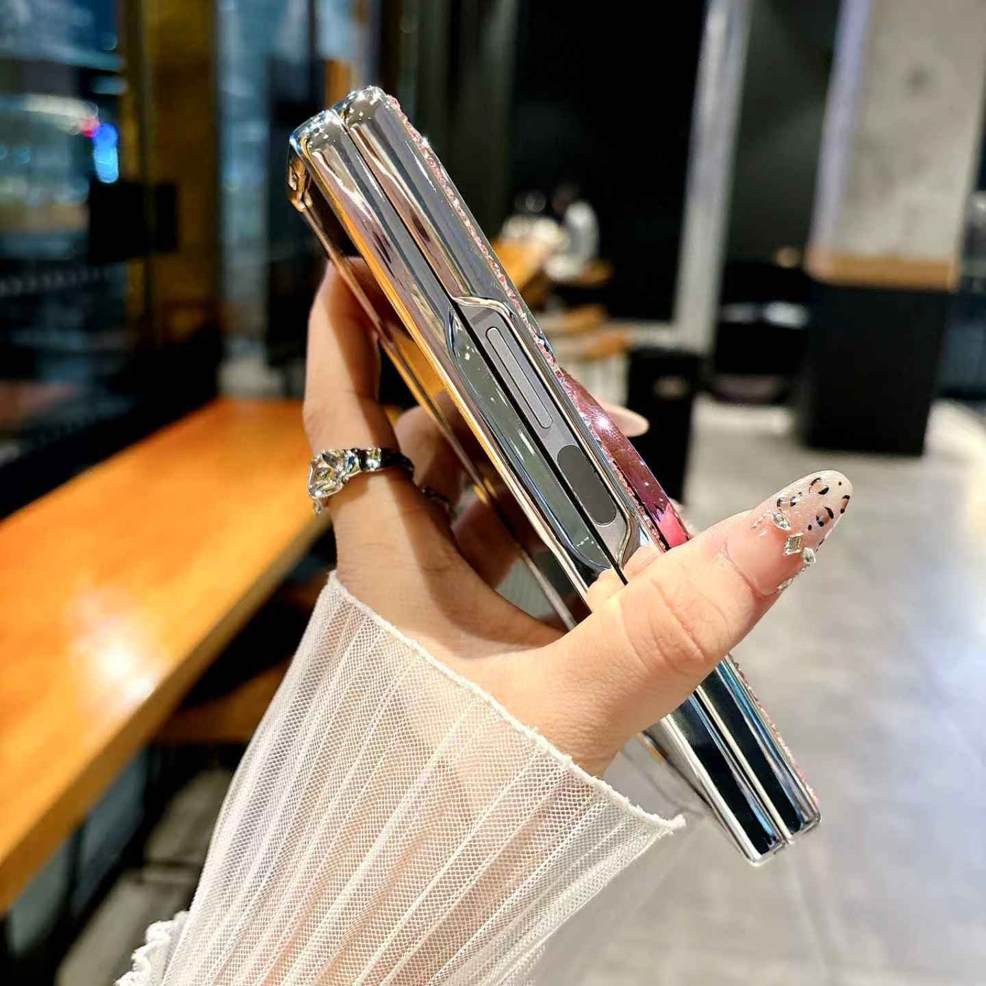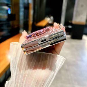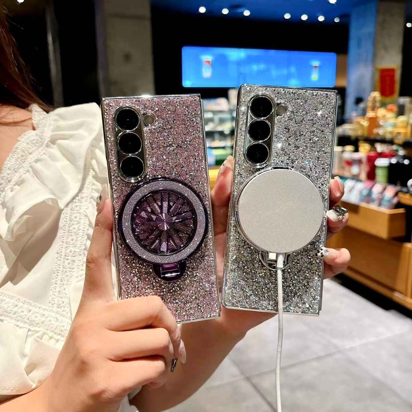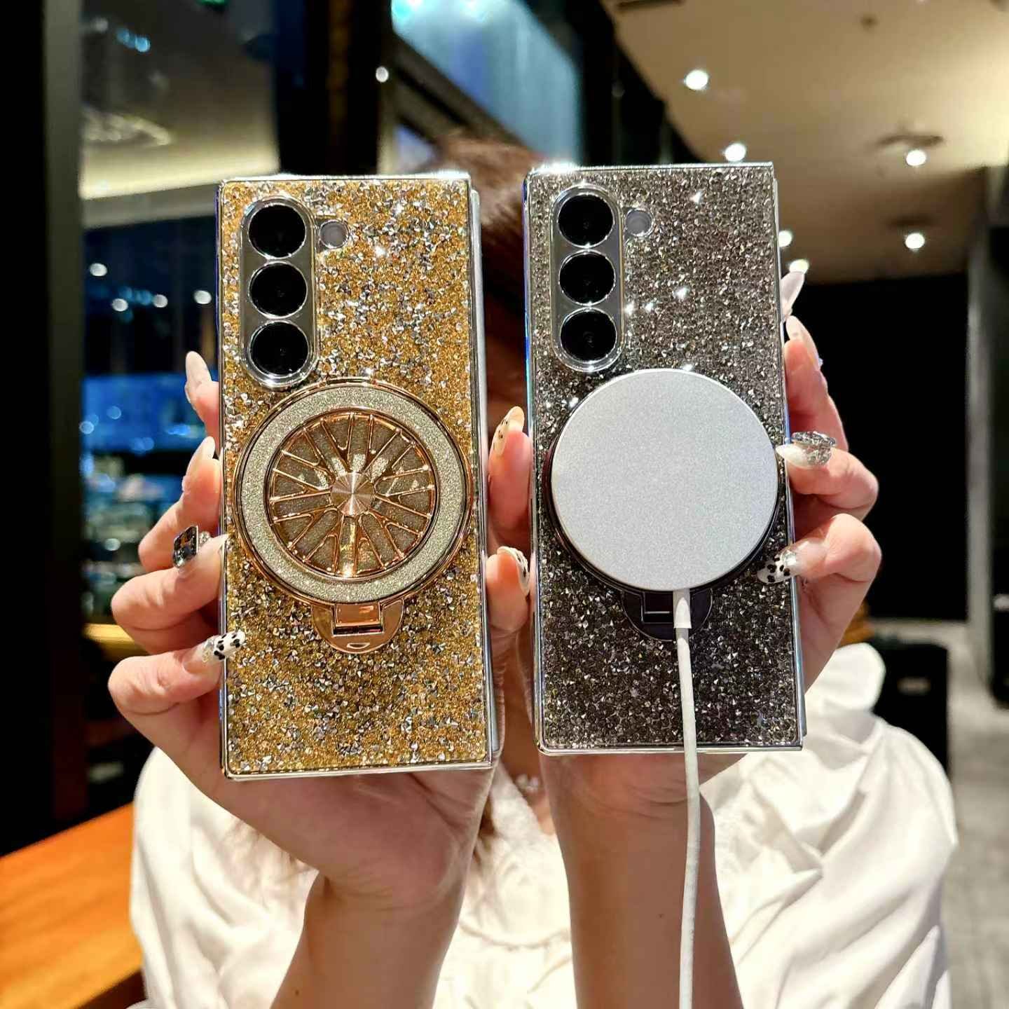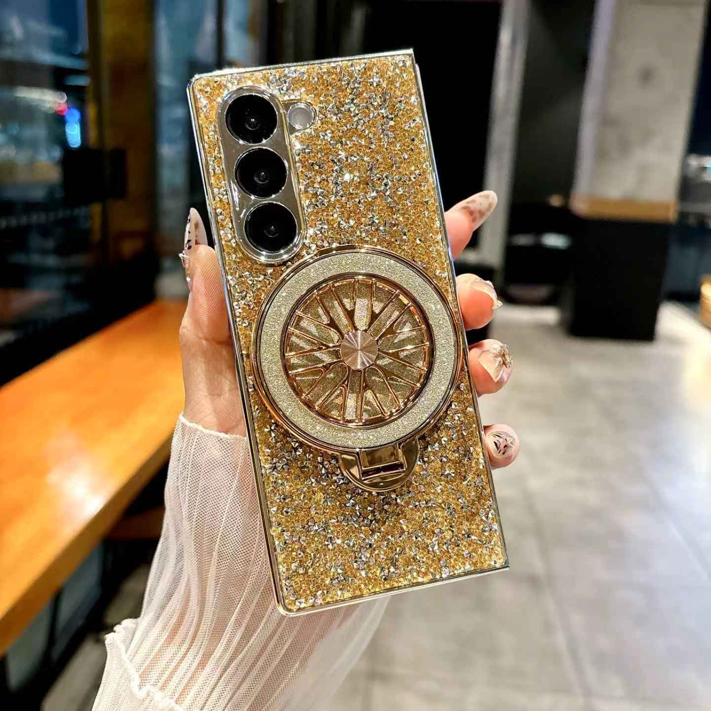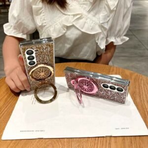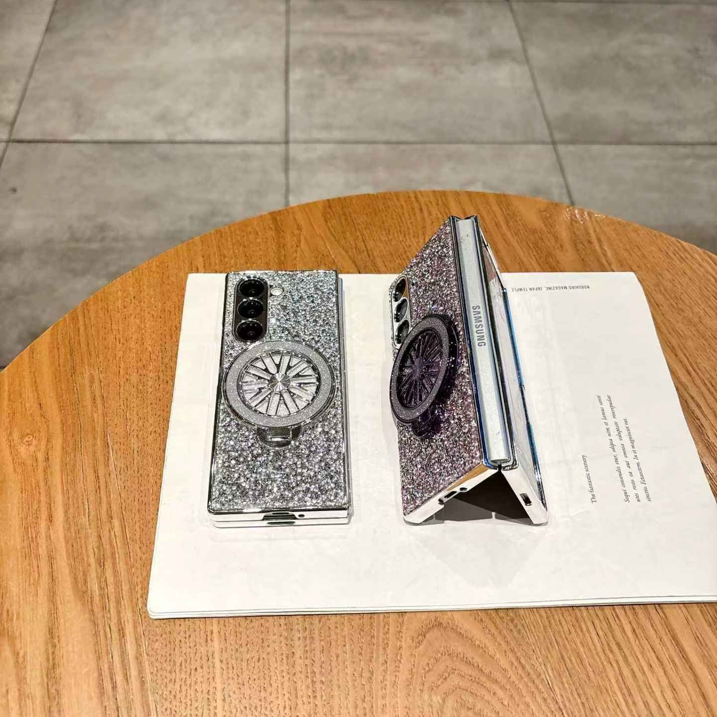 This is a bold and glam case with a high-impact look. The back is covered entirely in lavender-toned glitter, giving off a dazzling sparkle that catches light from all angles. The standout feature is the oversized wheel-shaped ring holder in metallic purple, which adds a futuristic-meets-fashion vibe.